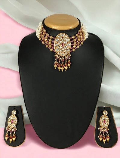 Kundan Choker Set Adorned With Pearls And Pastel Pink Beads is a high-quality handcrafted piece. This is an intricate piece designed in authentic semi-precious Kundan stone. This is the perfect piece for the perfect occasion.The intricate and elegant designs will surely get you tonnes of compliments.