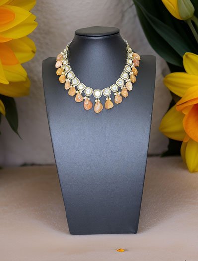 Elevate your allure with this opulent masterpiece adorned with Premium Quality Premium Kundan Necklace Set with Golden Turkish Beads Floats. This is a must-have piece for any sophisticated woman looking to enhance their fashion accessories collection. This necklace and drop earrings features with Premium Quality Kundan and Beautiful, shiny Golden Turkish beads, making it the perfect addition for any festive, formal occasion. The necklace is beautifully crafted with intricate details that add a touch of elegance to any outfit.The drop earrings are the perfect complement to this stunning necklace. This will be a perfect choice for those looking for an elegant, delicate piece of jewelry to stand out of the crowd!!