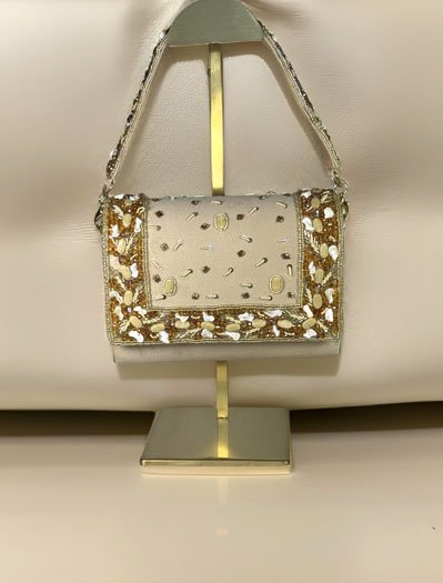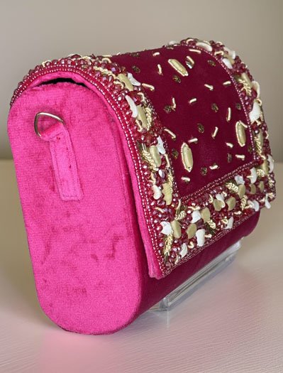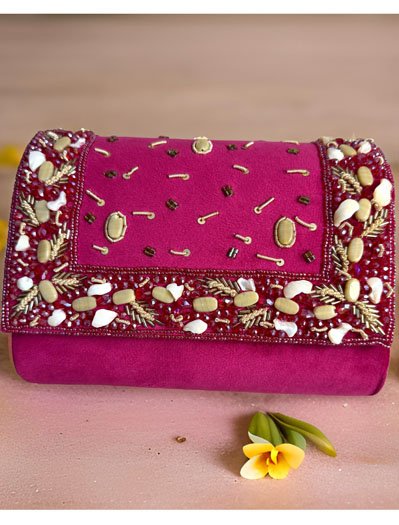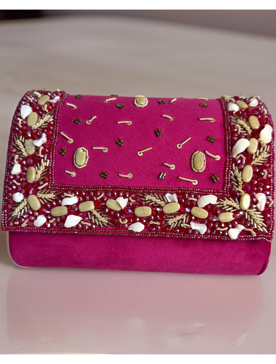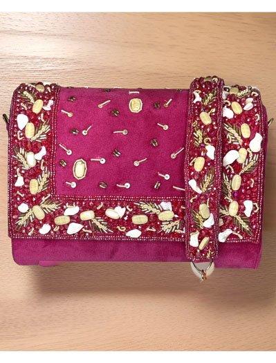 Exude elegance with Luxury velvet evening bag hand embroidered with matt gold light zardozi work, genuine carnelian stones, lustrous pearls and garnets makes a statement at any event or party! It comes with a luxurious embroidered strap. Zardozi was introduced into northern India in the early 16th century, and was used mainly to adorn the robes and accessories of the royal court. Now you too can have an evening bag that was once reserved for royalty! This beautiful handcrafted clutch bag is made with love by skilled local artisans. This clutch is a versatile, classy and a great additional to your wardrobe that will stick around with you for decades here on. This clutch is made with Velvet material and spacious enough to carry cell phones, lipsticks, Keys and other small accessories.