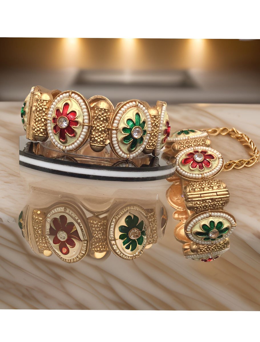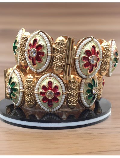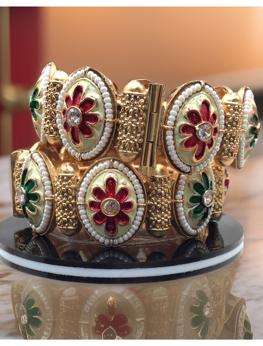 Elevate your traditional attire with our exquisite collection of Matt finish gold-plated Rajwadi Meenakari bangles. Each piece is a testament to craftsmanship, blending cultural richness with contemporary elegance. Crafted using high-quality gold, these bangles are durable and long-lasting, maintaining their stunning shine for years to come. These kadas looks great with traditional banarasi or zari silk sarees.