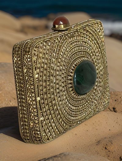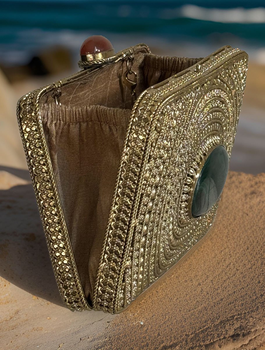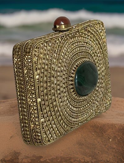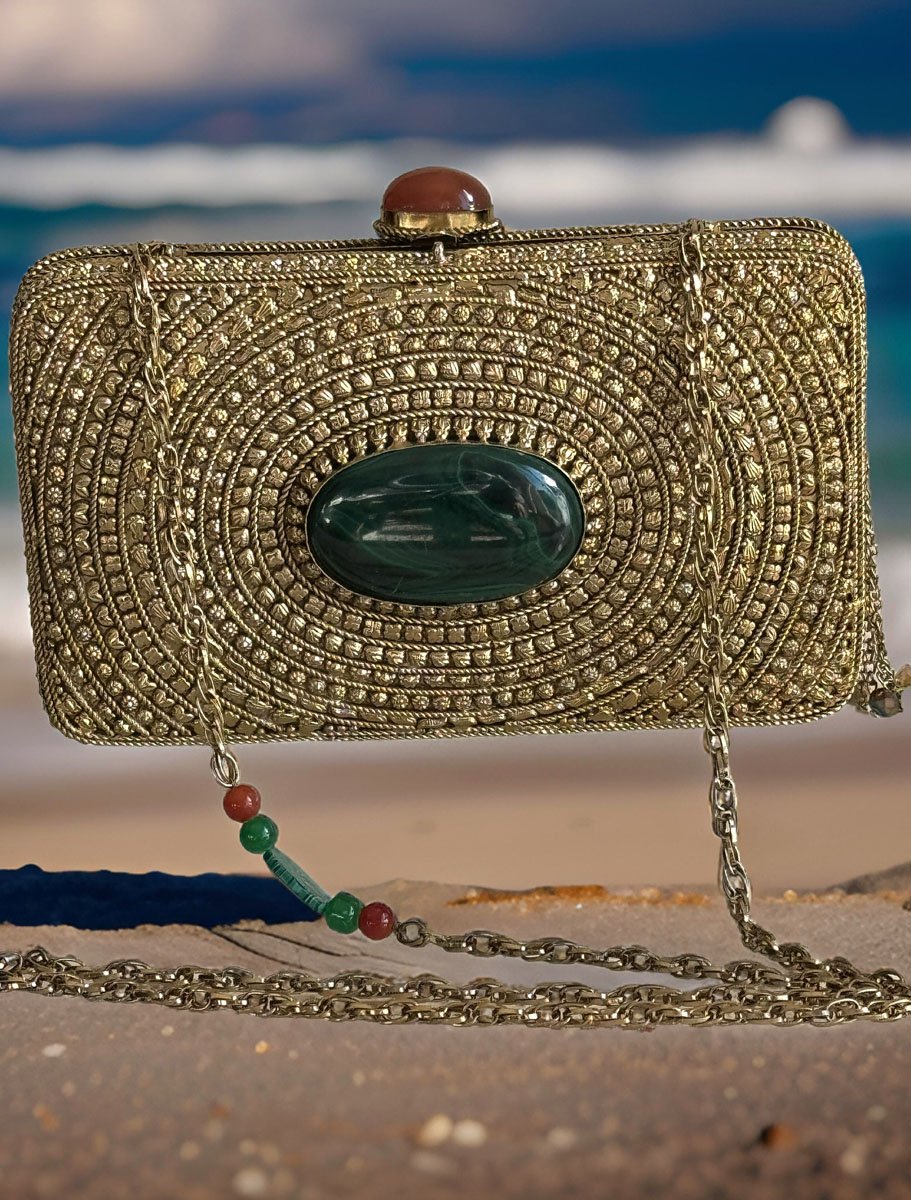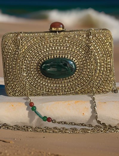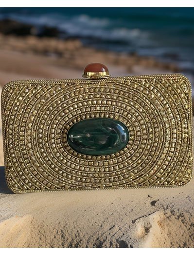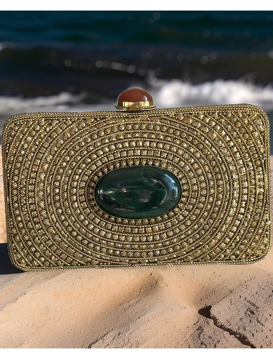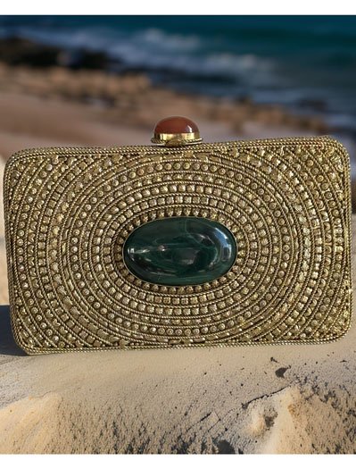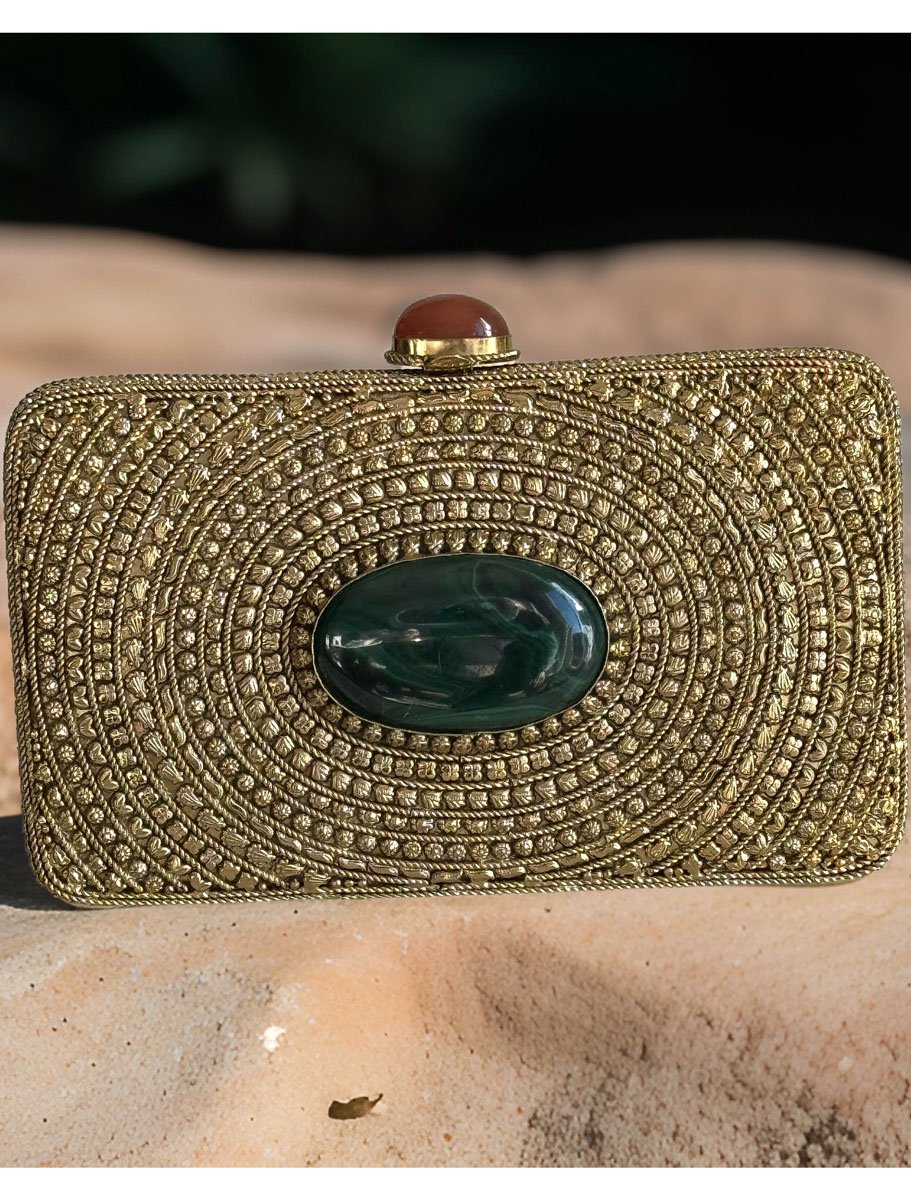 Matt Gold Intricate Designer Clutch with an Emerald Stone