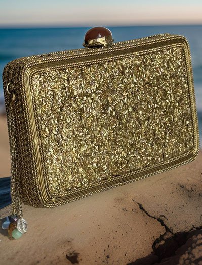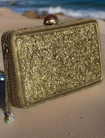 Elevate your evening ensemble with our exquisite Matt Gold Intricate Designer Clutch. Crafted for luxury-loving women, this evening bag exudes opulence and charm. This clutch features intricate embellishments and a luxurious golden finish, it's the perfect accessory to add a touch of glamour to any special occasion. Compact yet spacious enough for your essentials, it seamlessly combines style with functionality. Make a statement and dazzle the crowd with this stunning clutch in hand. Artisans make these beautiful handmade bags from families practicing craft-making for generations. These creative people spend around 30-40 hours crafting each bag with the utmost precision and care, taking time and effort to make a handmade bag uniquely made. It has a Ruby Stone button closure easy to open and off. It comes with 18"long golden metal chain with colorful beads. It's big enough for Any cellphone, keys, cards, and lipsticks other mini accessories