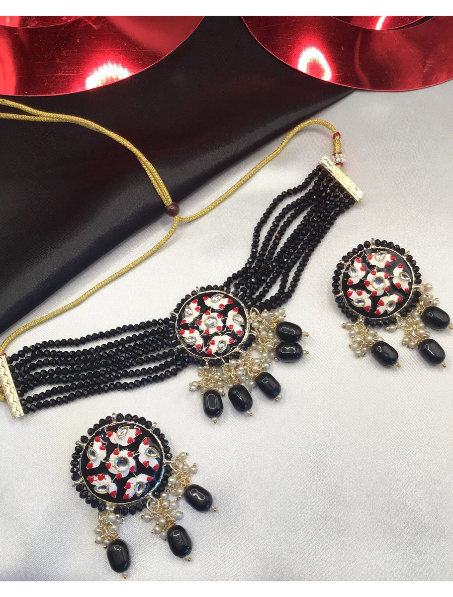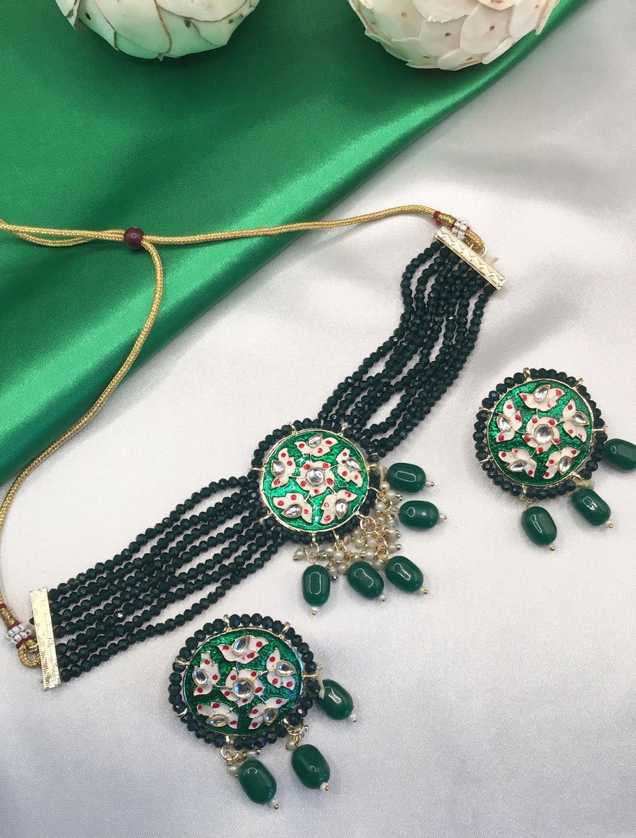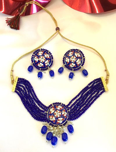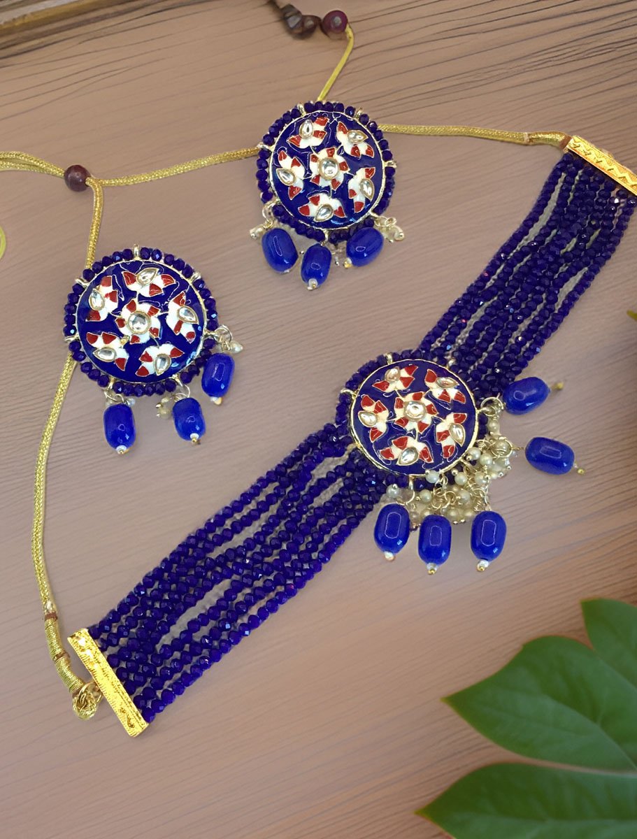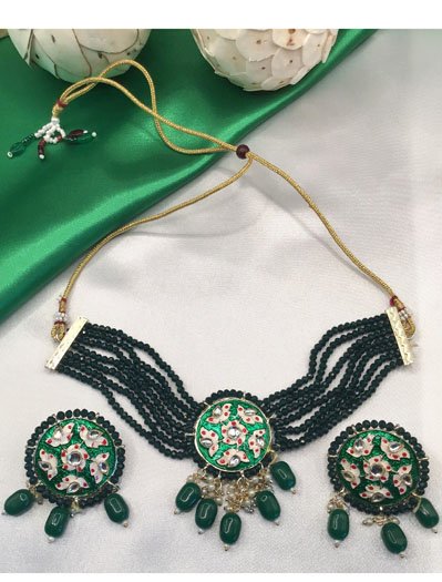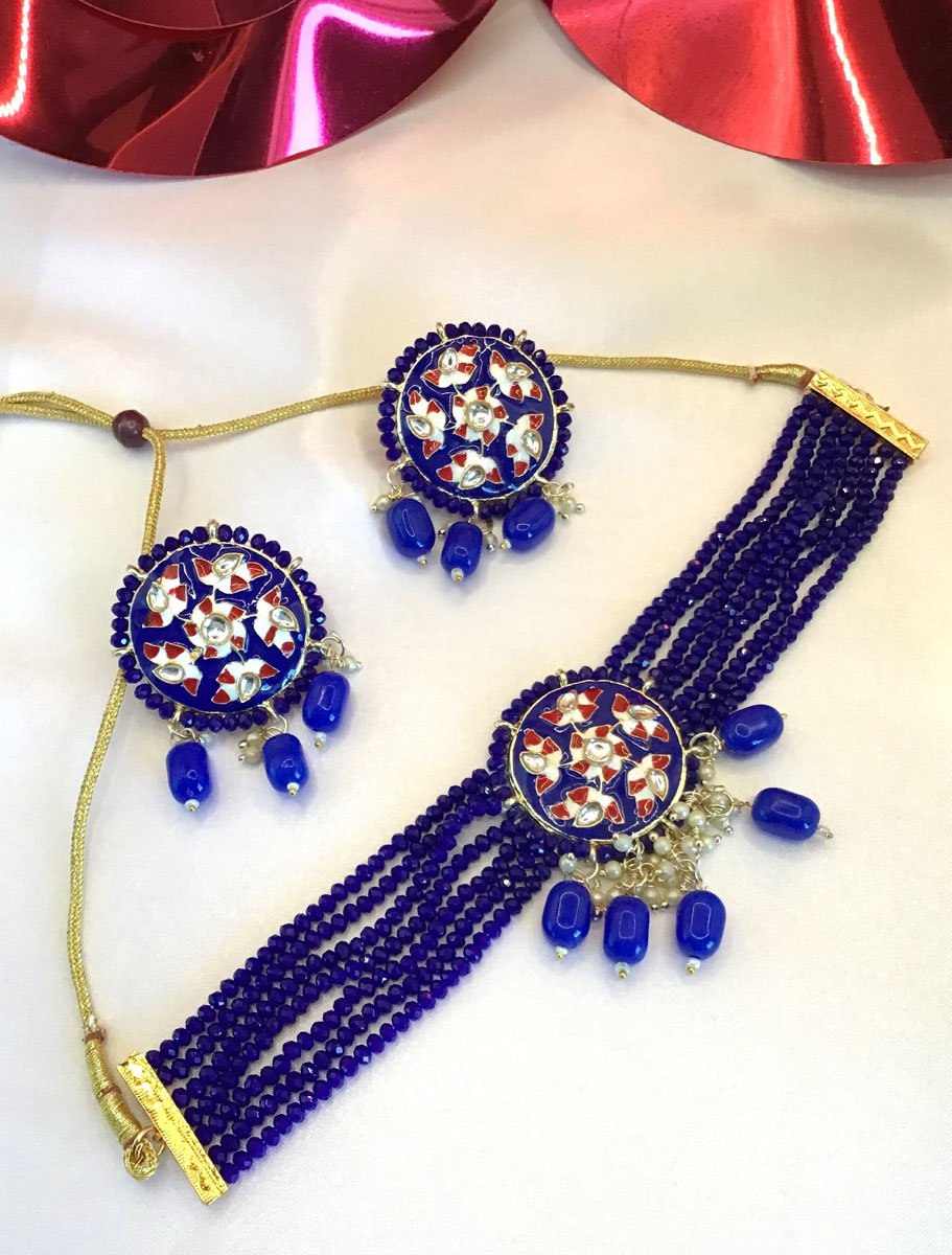 A lightweight meenakari choker set available in different colours. This set not only offers a comfortable fit around the neck but also showcases intricate meenakari work, adding to its allure.
