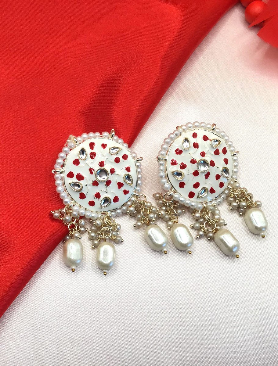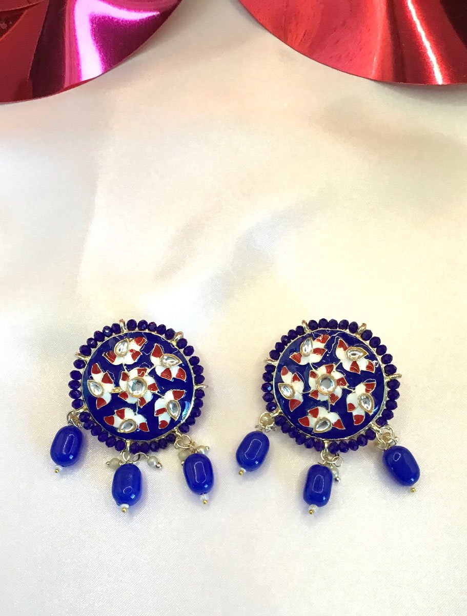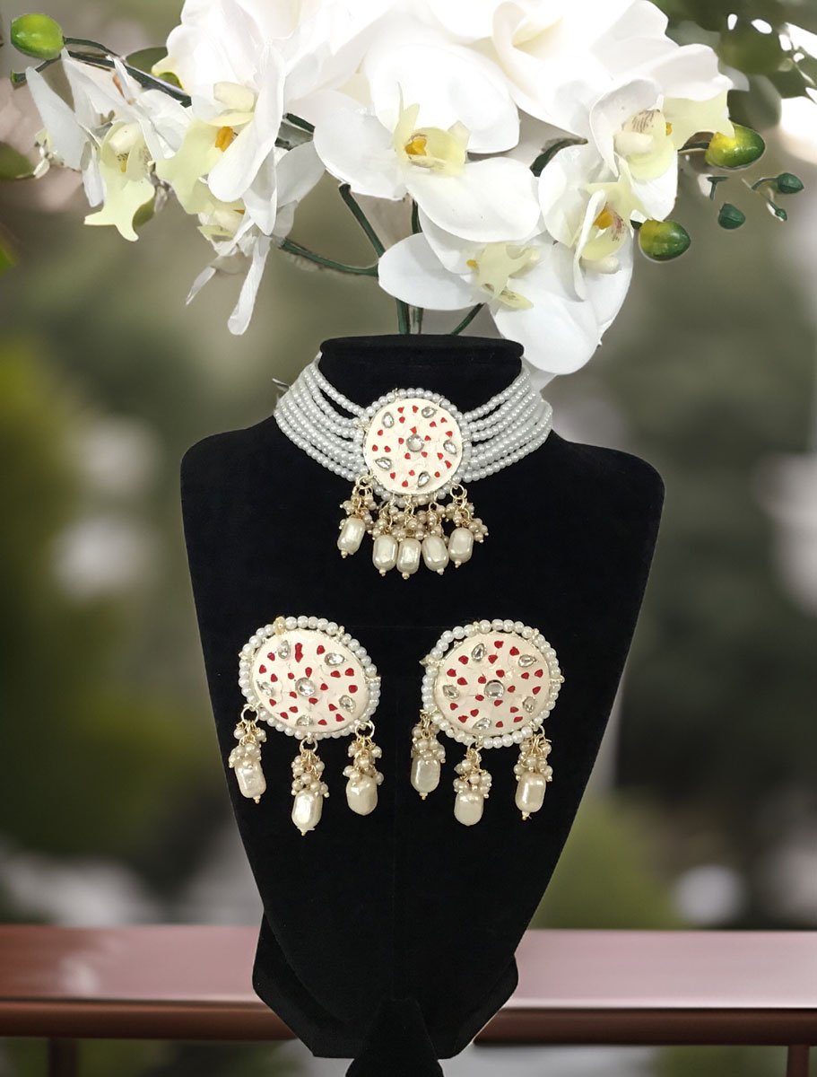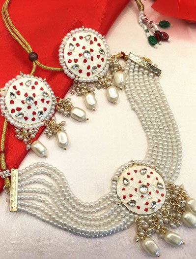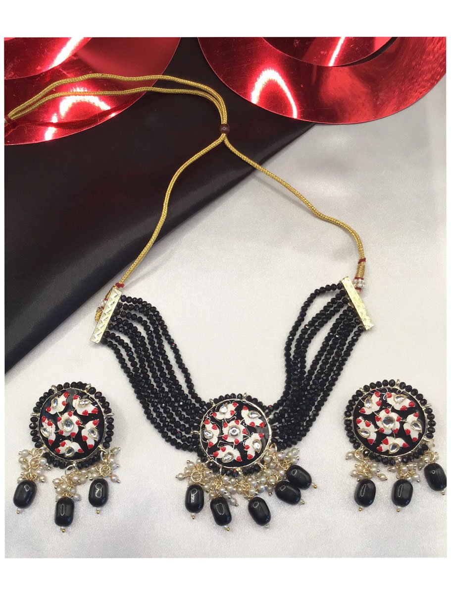 A lightweight meenakari choker set available in different colours. This set not only offers a comfortable fit around the neck but also showcases intricate meenakari work, adding to its allure.