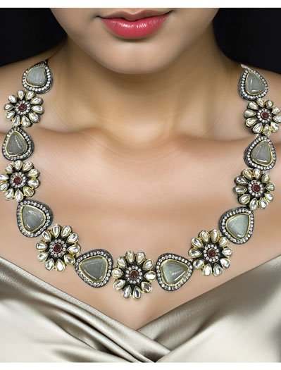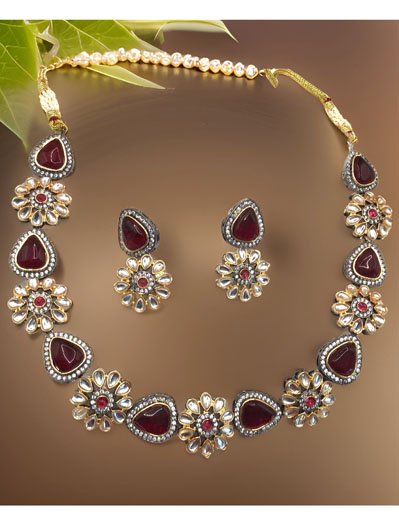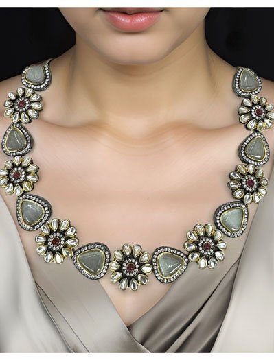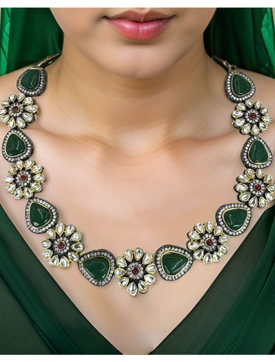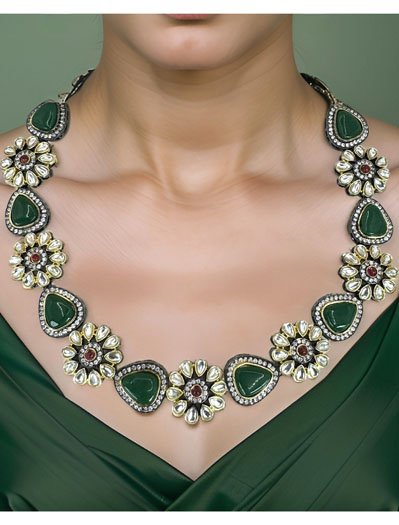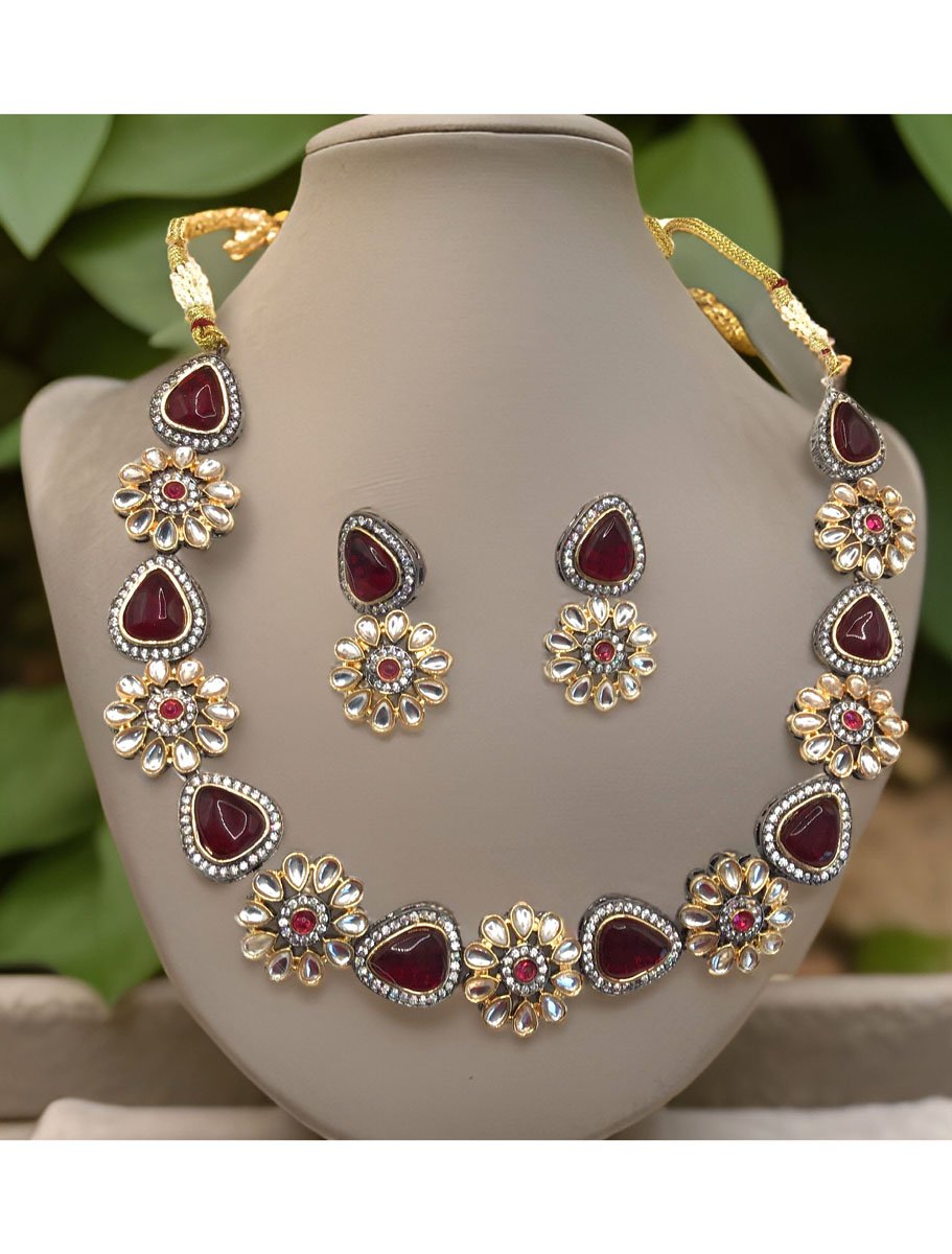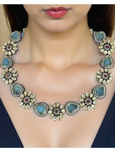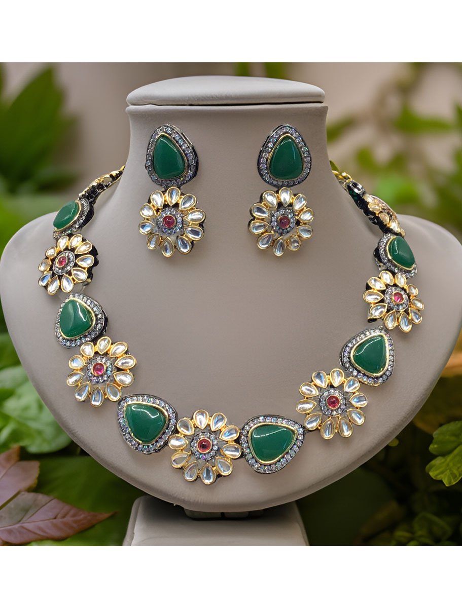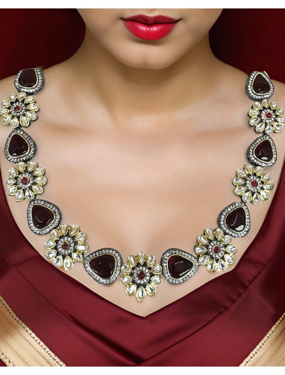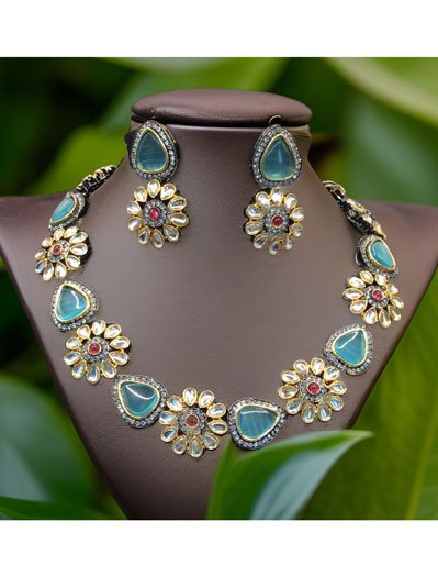 Experience sophistication with our Exclusive Designer Set, featuring Monalisa Stone and Kundan embellishments. Fits well on the neckline for an elegant look. Available in Maroon, Dark Green, Blue, and Grey Kundan necklace set. Elevate your look with this stylish and elegant jewelry set.