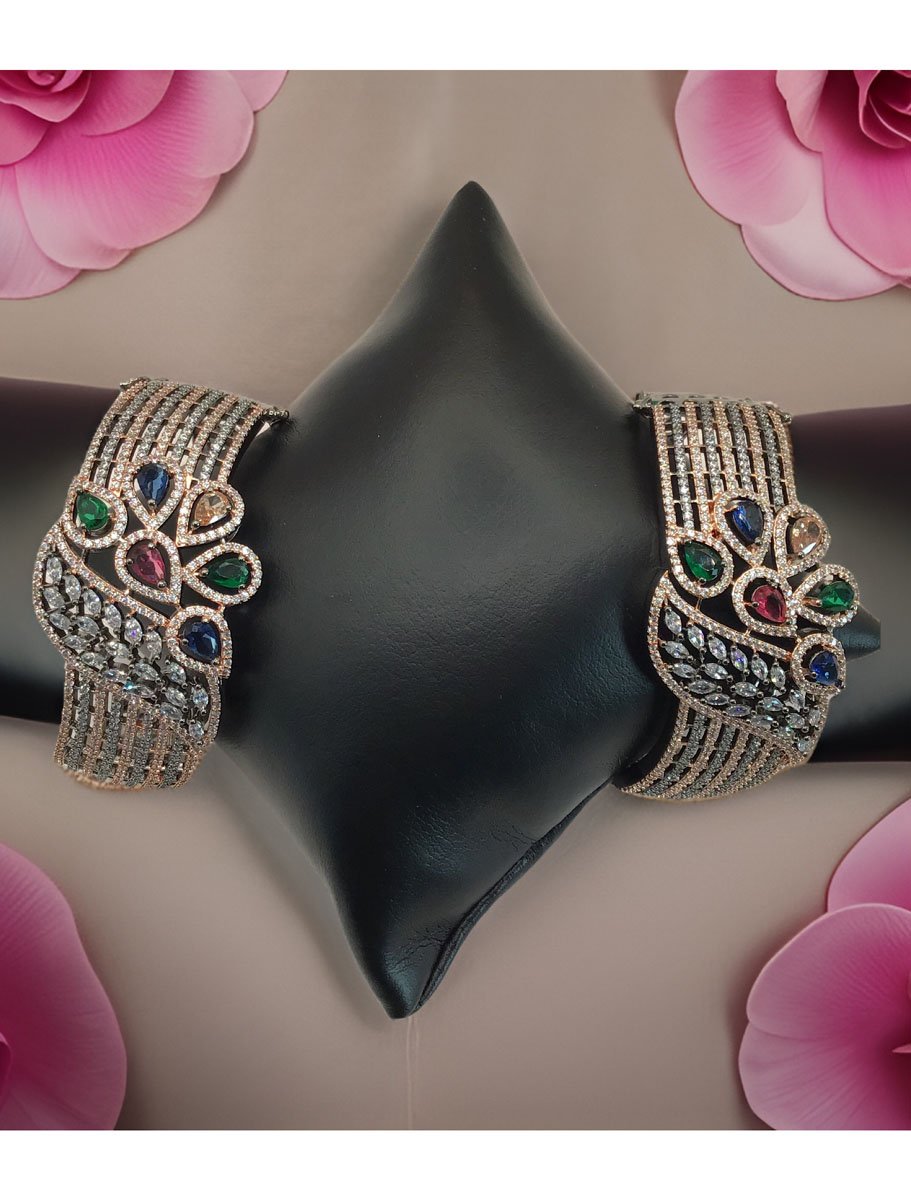 Designer CZ Victorian Bracelet made in copper and blaskish finish. Mutli colors (Ruby, Emerald, Sapphire) studded CZ stones and nice carving makes it very beautiful. Looks rich upon wearing. Perfect for party wear. Free size, can fit on 2/4 and 2/6 wrists. It is a single bracelet.