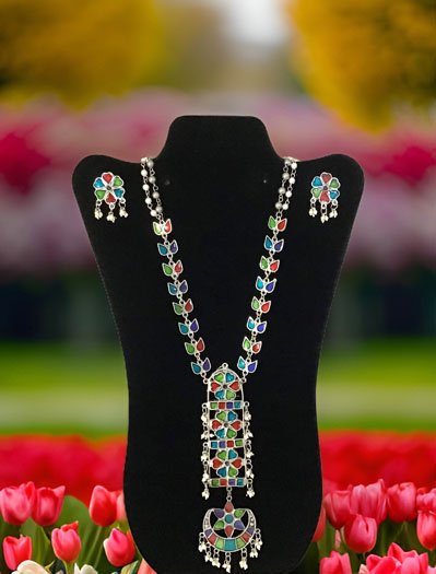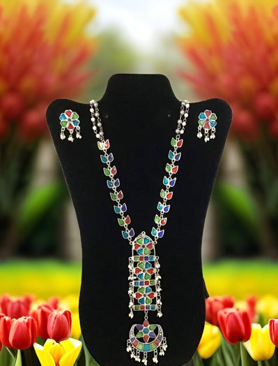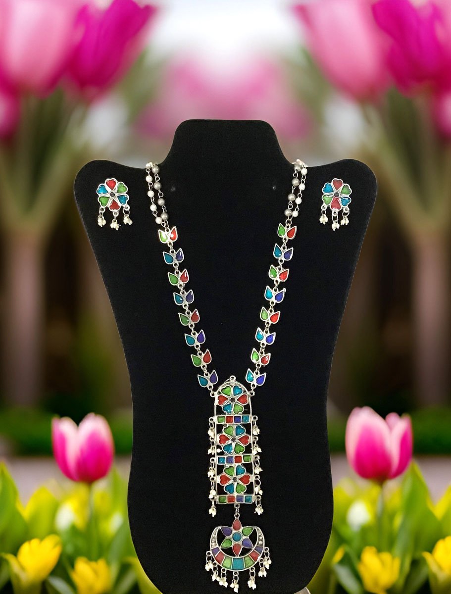 Multicolor Stone Oxidized Silver Long Necklace With Earrings