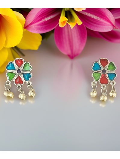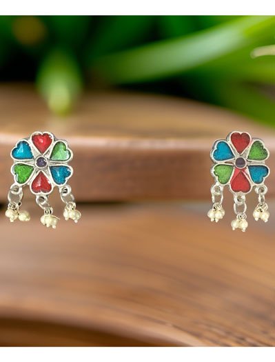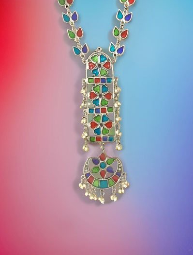 This multicolor stone oxidized necklace set is the perfect statement piece for your wardrobe. Featuring a necklace, w/ cute earrings. This Indian- Afghani Ghungroo necklace set is handcrafted with traditional Indian tribal designs. With its striking silver sheen and unique oxidized finish, this jewelry set will make any outfit stand out.