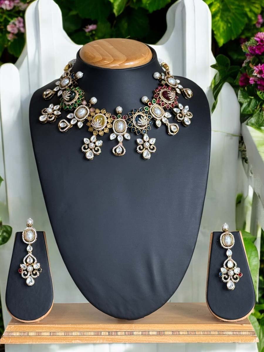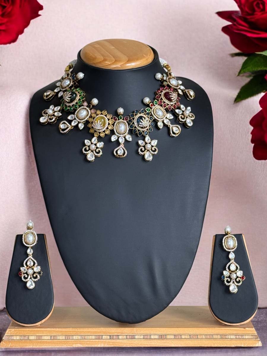 Elevate your allure with this opulent masterpiece adorned with Premium Quality Premium Kundan Necklace Set with Pearls, Monalisa and CZ stones. This is a must-have piece for any sophisticated woman looking to enhance their fashion accessories collection. This necklace and long earrings features with Premium Quality Kundan and Beautiful, shiny Monalisa Stones surrounded by AAA quality CZ stones, making it the perfect addition for any festive, formal occasion. The necklace is beautifully crafted with intricate details that add a touch of elegance to any outfit.Long earrings are the perfect complement to this stunning necklace. This will be a perfect choice for those looking for an elegant, delicate piece of jewelry to stand out of the crowd!!