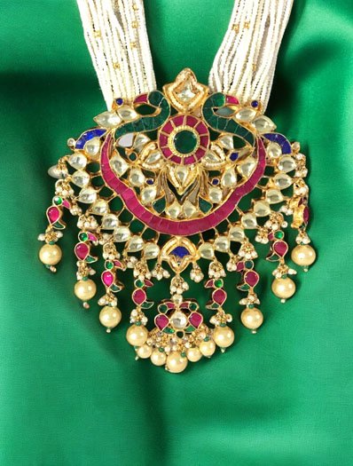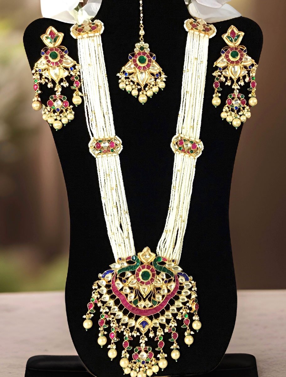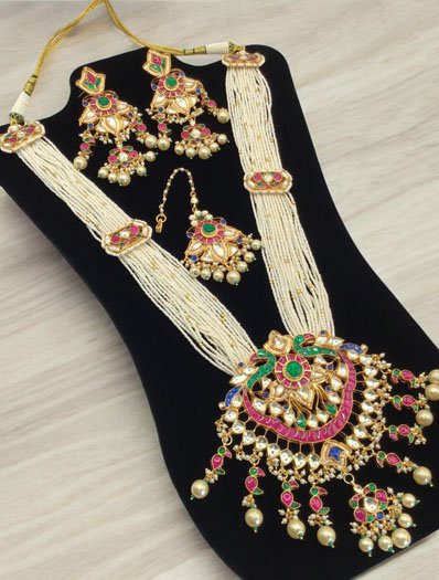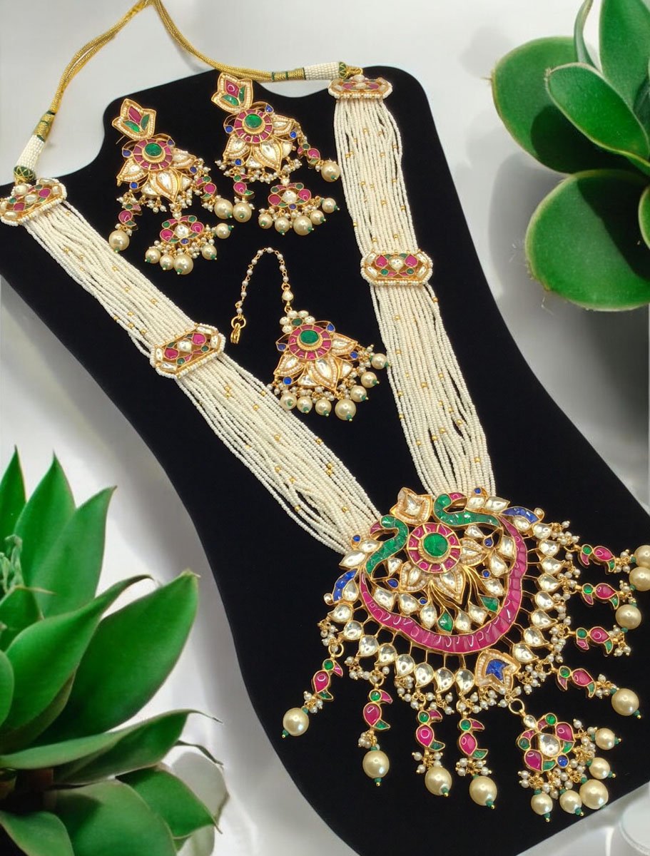 The artistry of the Pachi Kundan Rani Haar traces its origins back to India's Mughal era. This jewelry piece epitomizes exceptional craftsmanship through intricate designs and the use of precious, colorful stones and metals. Revered for its enduring beauty and grace, Pachi Kundan jewelry is accompanied by matching earrings and a maangtikka.