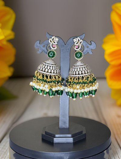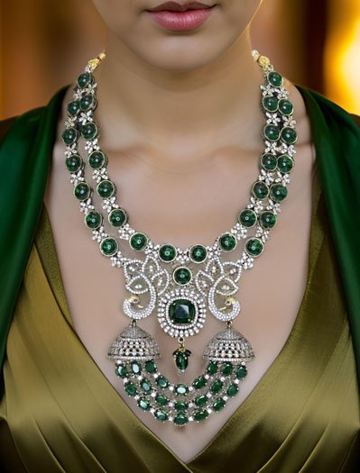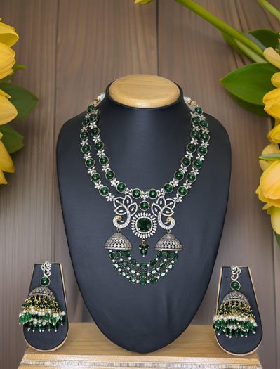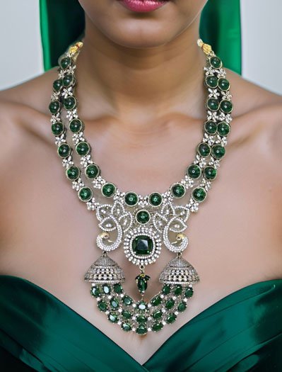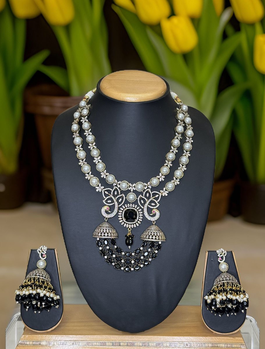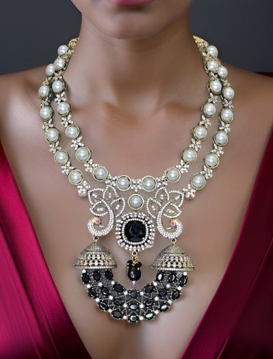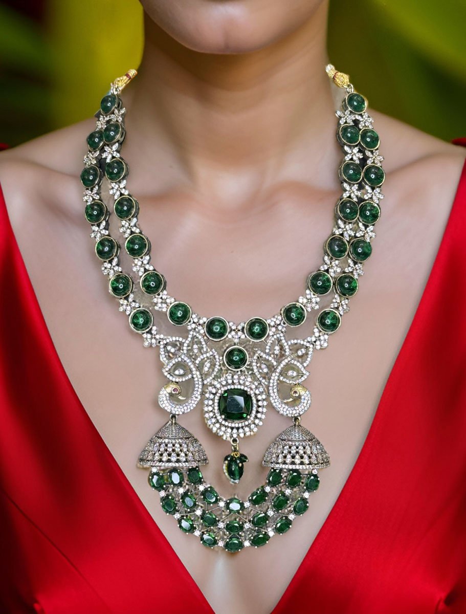Make a dazzling impression with this exquisite Peacock, Flower Carved CZ Pearl Necklace set. This stunning jewelry piece is perfect for someone who want to make a statement on their special day. The necklace features a beautiful 2 layer design adorned with AAA CZ stones Peacocks, Emerald American Diamon and Premium Quality Pearls. The emerald-colored Gemstones in the center add a touch of elegance and sophistication to the overall look. Crafted with meticulous attention to detail, this necklace set is made to impress. It is designed to complement various styles, whether you're going for a traditional or contemporary look. The choker necklace sits comfortably on the neckline, enhancing your natural beauty and adding a glamorous touch to your ensemble. This necklace set is also available in White Shell Pearls with Black Stones.