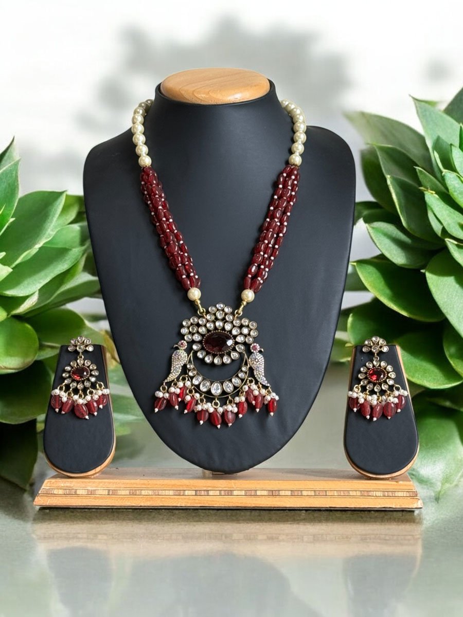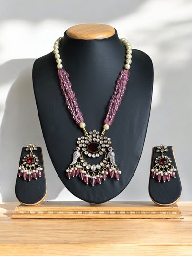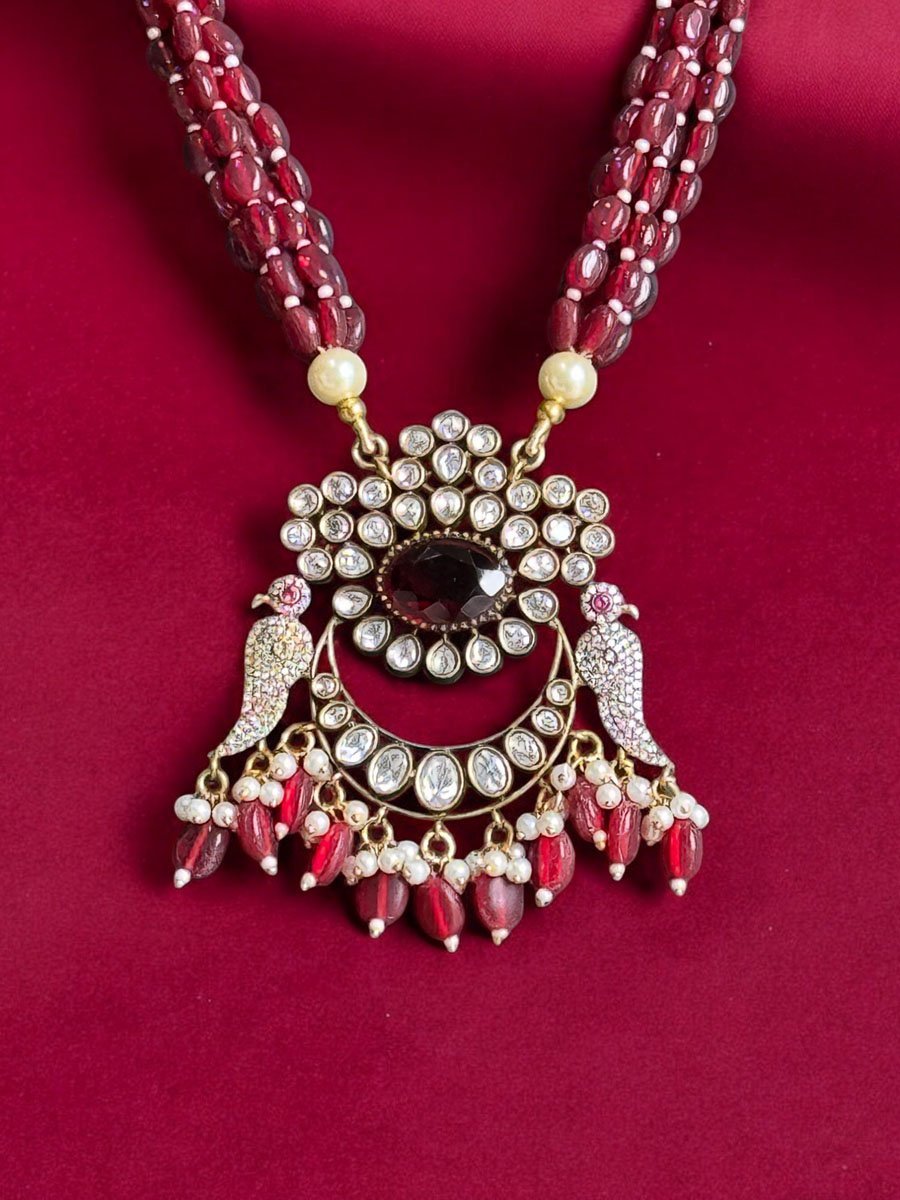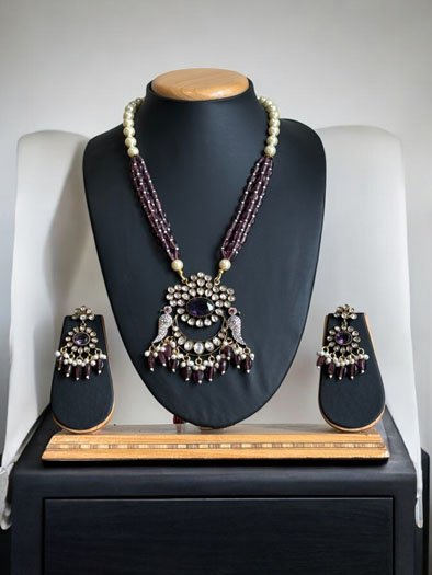Peacock Design Long Kundan Necklace, made in brass, with high quality kundan, CZ stones and oynx beads. Its unique Peacock design with studded Kundan and semi-precious colorful jade beads enhance the overall look. Adorned with matching attire it will add brilliance and spark to the entire look. Perfect choice for weddings, parties, gifting, and other Indian festivals. Available in Pink, Purple, Maroon and Blue colors.