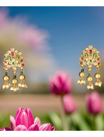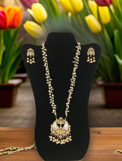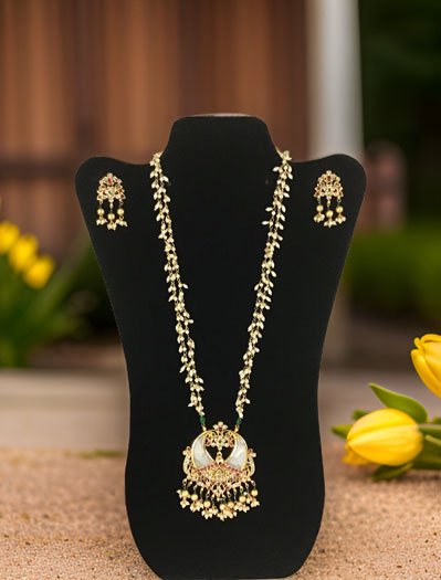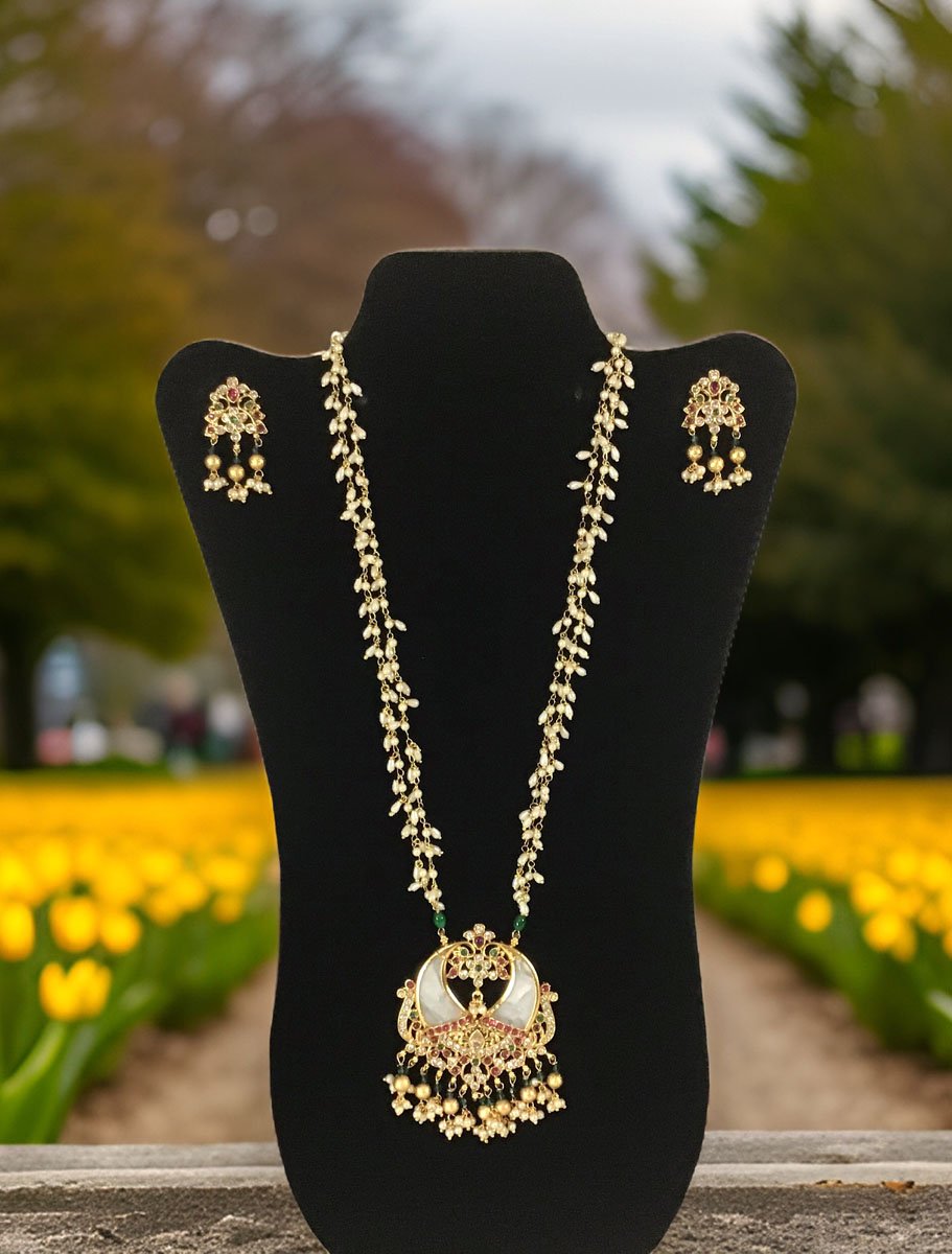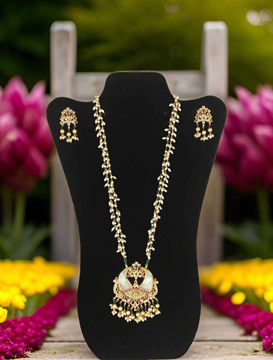An elegant Kemp stone pendant necklace to elevate your attire. A cute Pendant is studded with Pearls and 2 matt gold finish peacocks are sitting on the outer edge, studded with White CZ stones and Red/Green Kemp stones. Top of the pendant and center piece is studded with colorful Kemp stones, golden pearl zhumkis are adding a sophisticated look. Necklace chain is delicate two pearl strains with an adjustable dori. It comes with a cute stud earring.This can be worn as a regular necklace (as shown in the mannequin) or close to neck necklace (shown in the mannequin). Suitable for Wedding, ethnic wear, festive and party wear outfits.