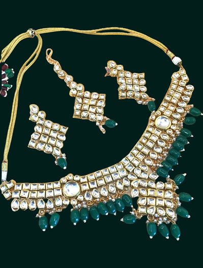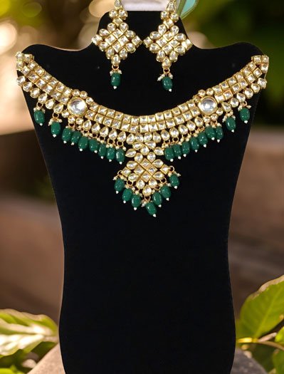 Fine Quality Kundan Choker Set with Green Onyx Beads. The backside features exquisite Meenakari work. Includes earrings and a maangtika for a complete set.