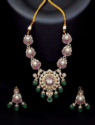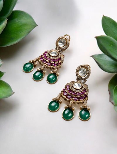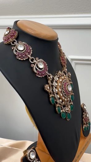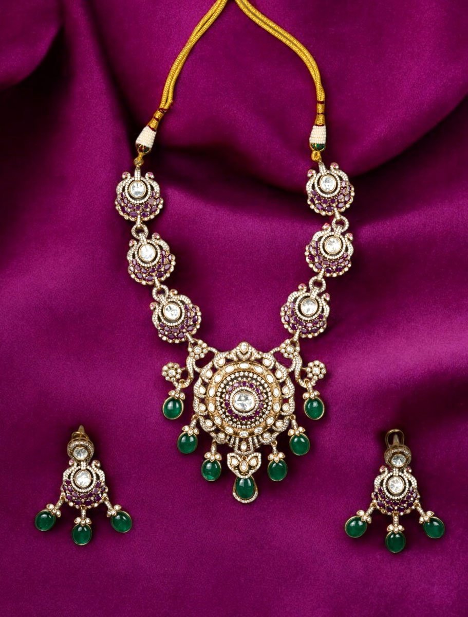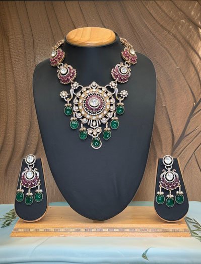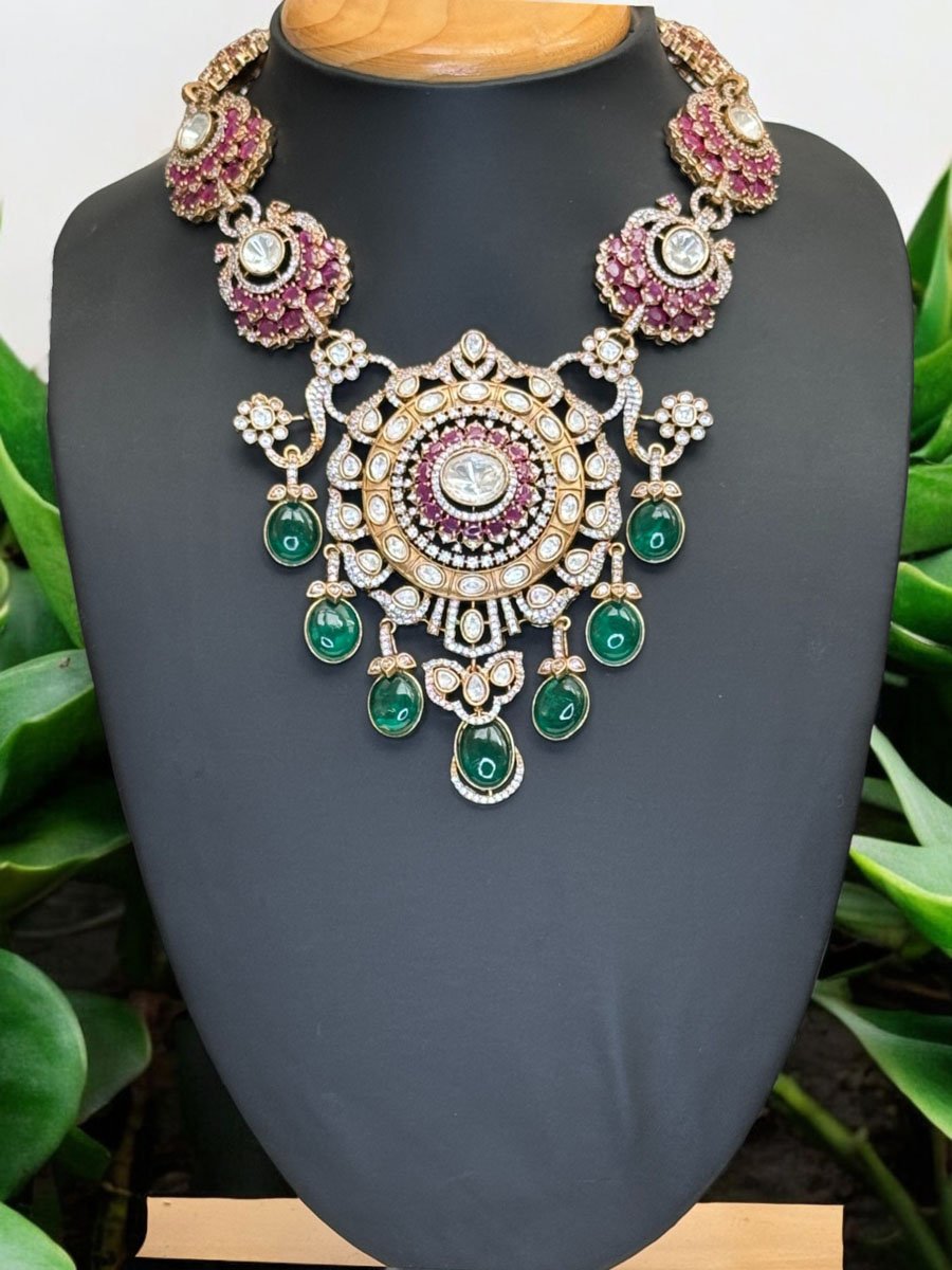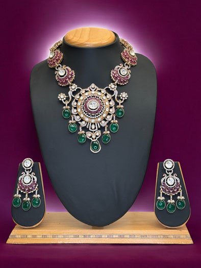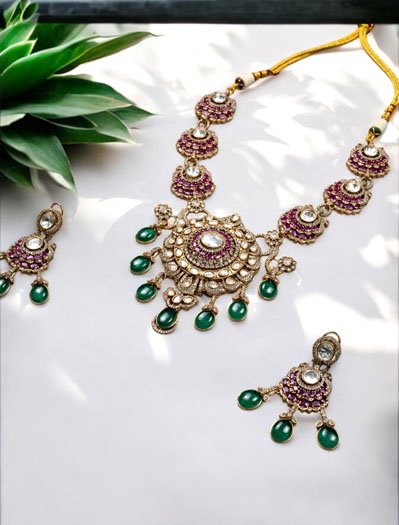 Indulge in the timeless allure of this exquisite Premium-quality uncut Moissanite Kundan Semi-Bridal Necklace Set, complete with dazzling earrings. Immerse yourself in the regal charm of Bollywood Inspired jewelry, as this meticulously crafted ensemble combines traditional elegance with contemporary style. The necklace features intricately set Premium uncut Moissanite White and Ruby stones, known for their unmatched brilliance and authenticity. Each piece is a testament to fine craftsmanship and attention to detail. The accompanying earrings complement the necklace seamlessly, enhancing the overall allure of the set. Perfect for semi-bridal occasions, weddings, or any special celebration, this jewelry set adds a touch of sophistication and cultural richness to your ensemble. Elevate your style with this statement piece that captures the essence of Indian heritage jewelry, showcasing a harmonious blend of tradition and modernity. Embrace the allure of timeless beauty with this Polki uncut Kundan jewelry set, a true reflection of elegance and grace!!