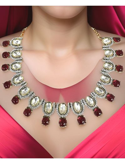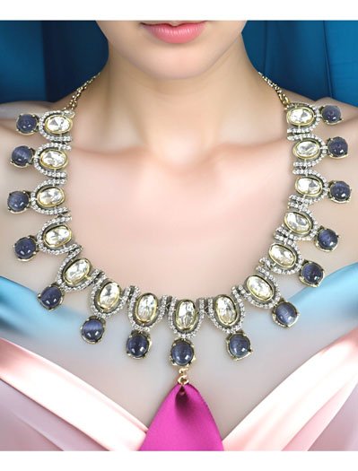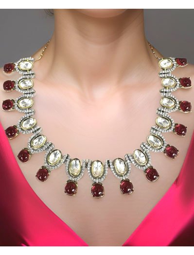 Pure Brass Real Kundan Necklace set with an adjustable length, detailed craftsmanship and nice, smooth finishing. Also available in Ruby Red and Focasia color.