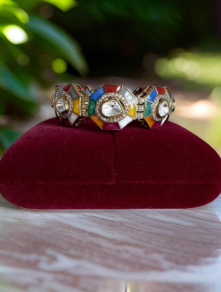 Stand out in the crowd with this Gold Kada Bracelet featuring Rainbow accents. A timeless piece radiating elegance and sophistication. Add a touch of luxury and elegance to your look with this premium designer Kundan CZ Kada Bracelet. Crafted with precision and care, this kada features a beautiful enamelled work with Rainbow colors Octagones studded with Premium Quality Kundan. Each Kundan is surrounded by fine quality CZ stones and Octagones links are also studded with AAA quality, shiny CZ stones. Made of long lasting brass metal, premium colors and Kundan. This unique design is a timeless accessory, suitable for both traditional occasions and contemporary fashion statements. Openable Kada, fits well on 2x4 wrist.
