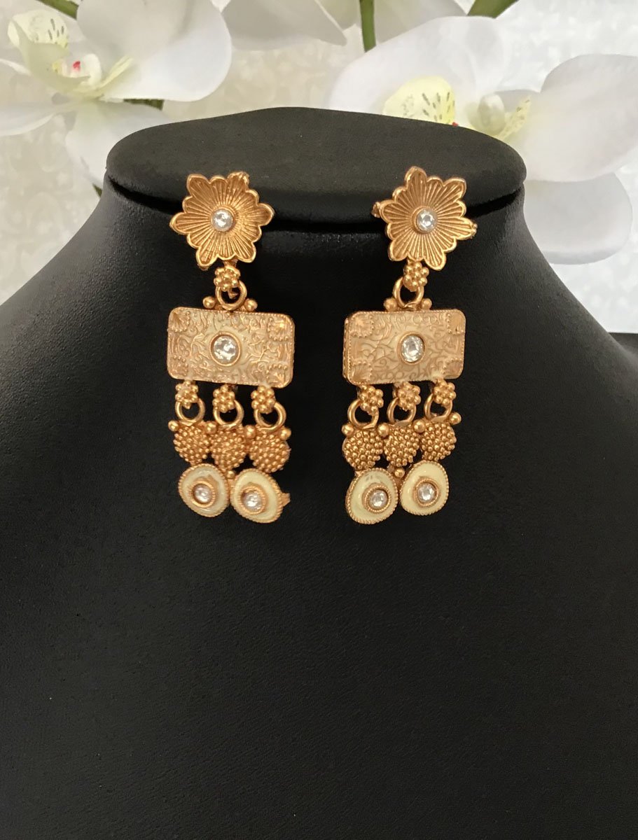 Rajwadi Long necklace set made in copper with nice craftsmanship and meenakari polish, decorated with colorful stones and carved motifs. Looks elegant upon wearing. Perfect for party wear and festive occations.