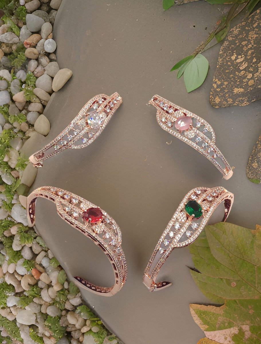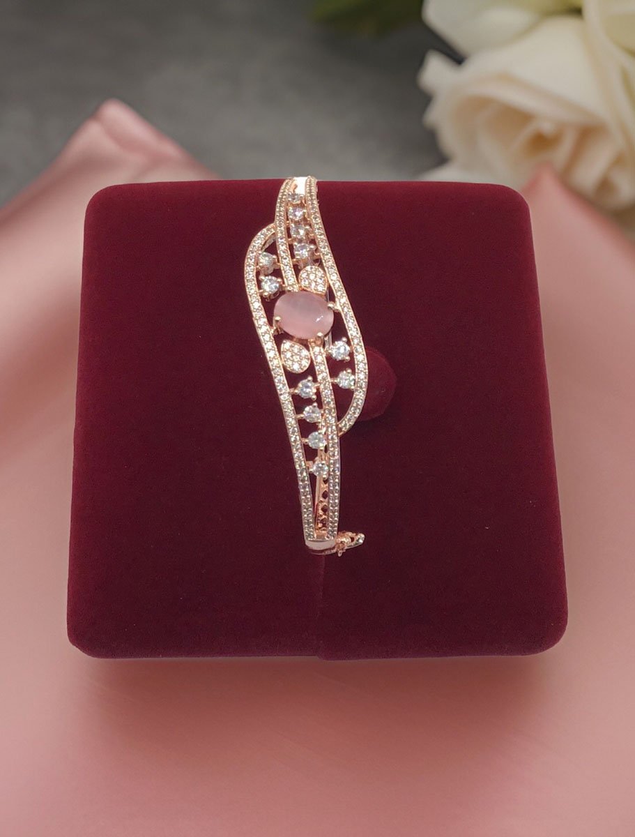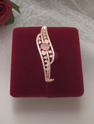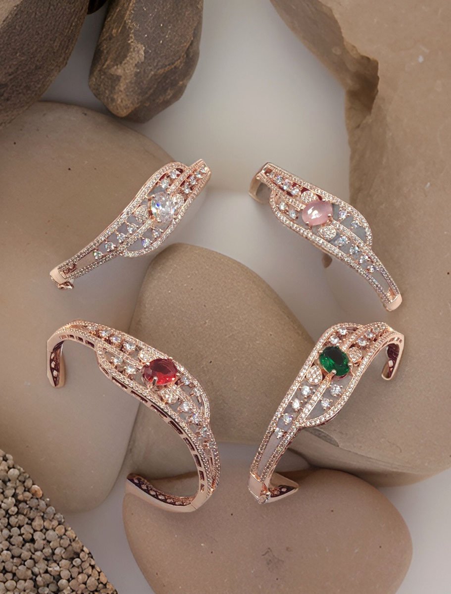 The premium quality CZ Studded Openable Rosegold Bracelet With Monalisa Stone. This stylish design bracelet is to elevate your outfit. Available in Ruby, Pink, Emerald and Clear colors.