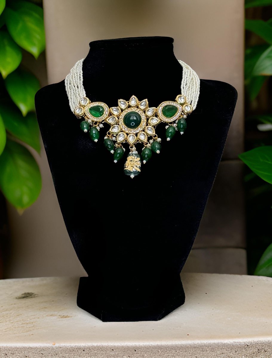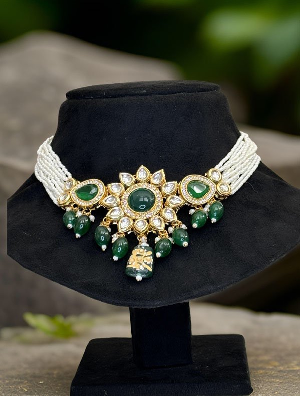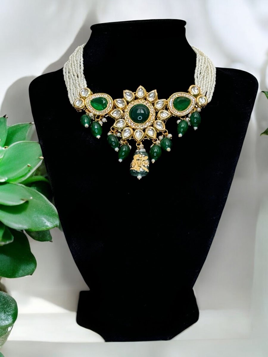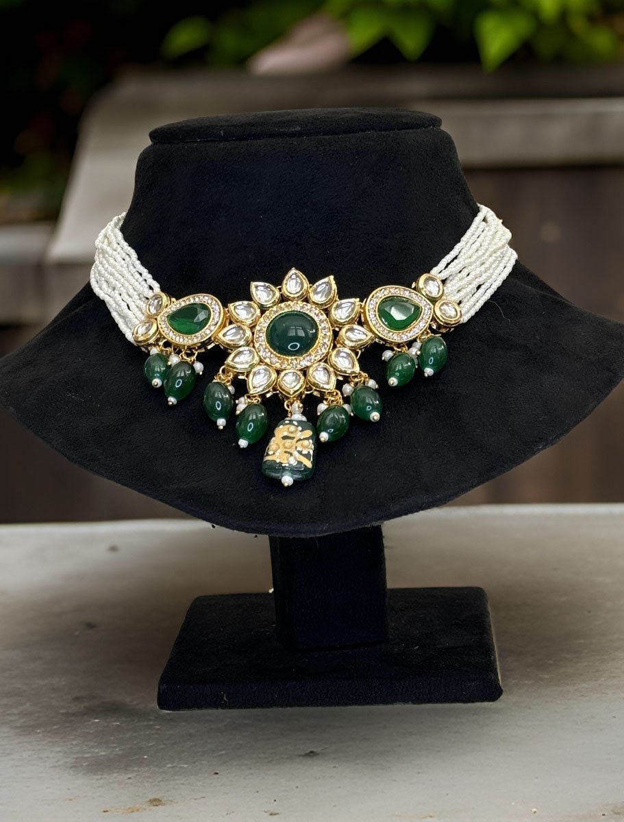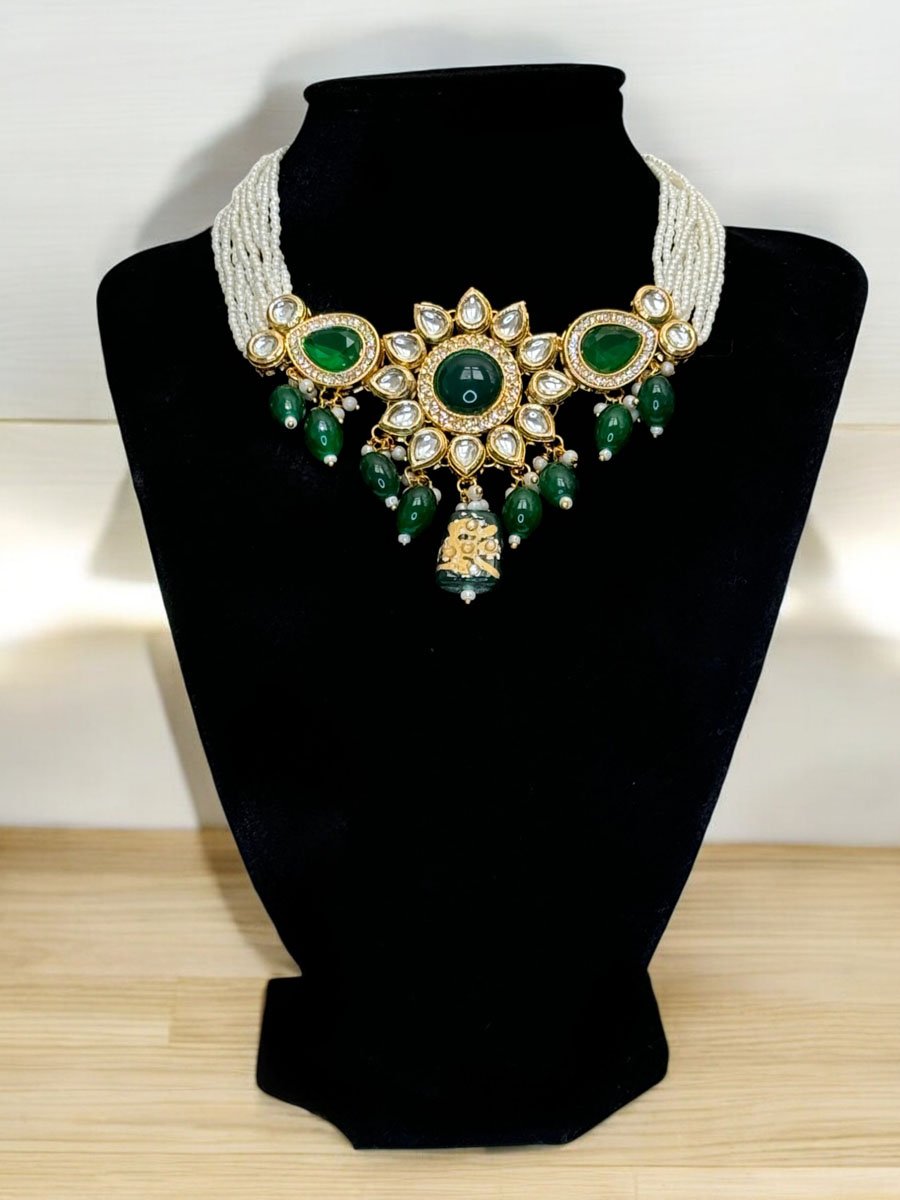Round Shaped Pendant Emerald Pearl Kundan Choker Set