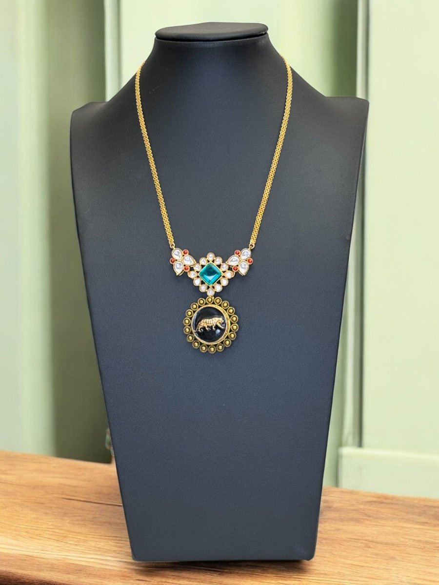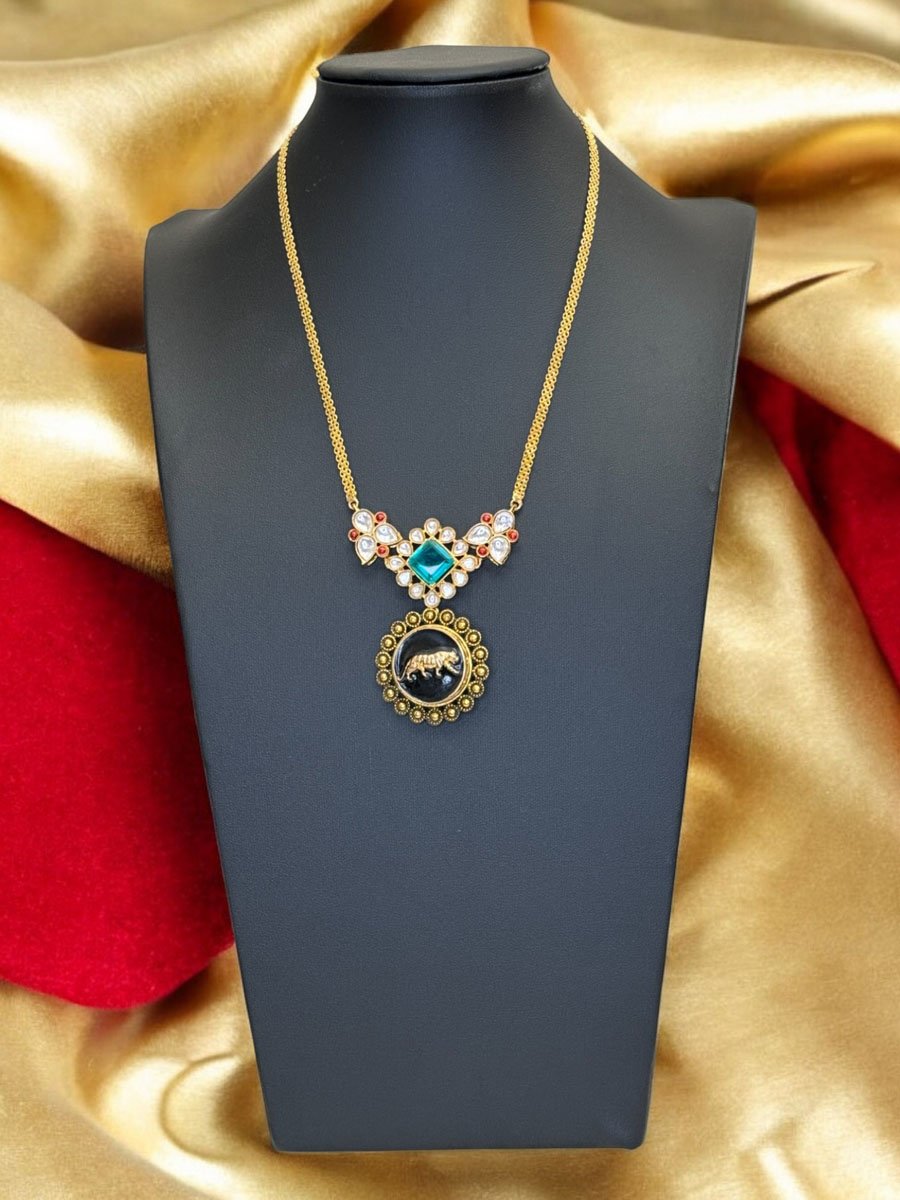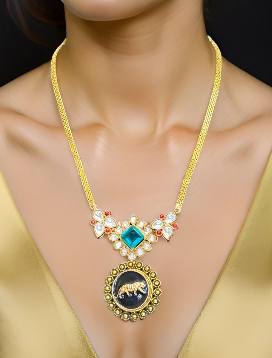 Indulge in the regal elegance of our Sabyasachi Inspired pendant sets, meticulously crafted to bring a touch of timeless beauty to your jewelry collection. Each pendant set embodies the essence of luxury and traditional artistry, making them perfect for any special occasion or to elevate your everyday style. A stunning combination of intricate Kundan work and bengal tiger motif, this pendant set is adorned with a peacock blue stone in the center that capture the light beautifully. The delicate chain complements the elaborate pendant, creating a harmonious balance of grace and grandeur. This set features a majestic lion motif, symbolizing strength and courage. The accompanying earrings with lion motifs, completing this statement piece.