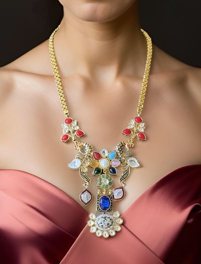 Experience the pinnacle of elegance with this beautiful Sabyasachi Inspired fusion pendant necklace set. Its timeless design and superior quality makes it an essential addition to your jewelry collection. Be the epitome of grace and charm; shop our collection today. Crafted with high-quality brass, copper, dual tone plating, stones, beads, enamelled work, Kundan embellishments, this necklace boasts enduring quality and a radiant finish. Our artisans have poured their skill and passion into creating a set that will leave admirers in awe. Elevate your look with this stunning piece that blends traditional charm with contemporary flair.