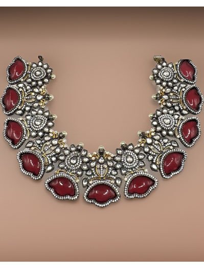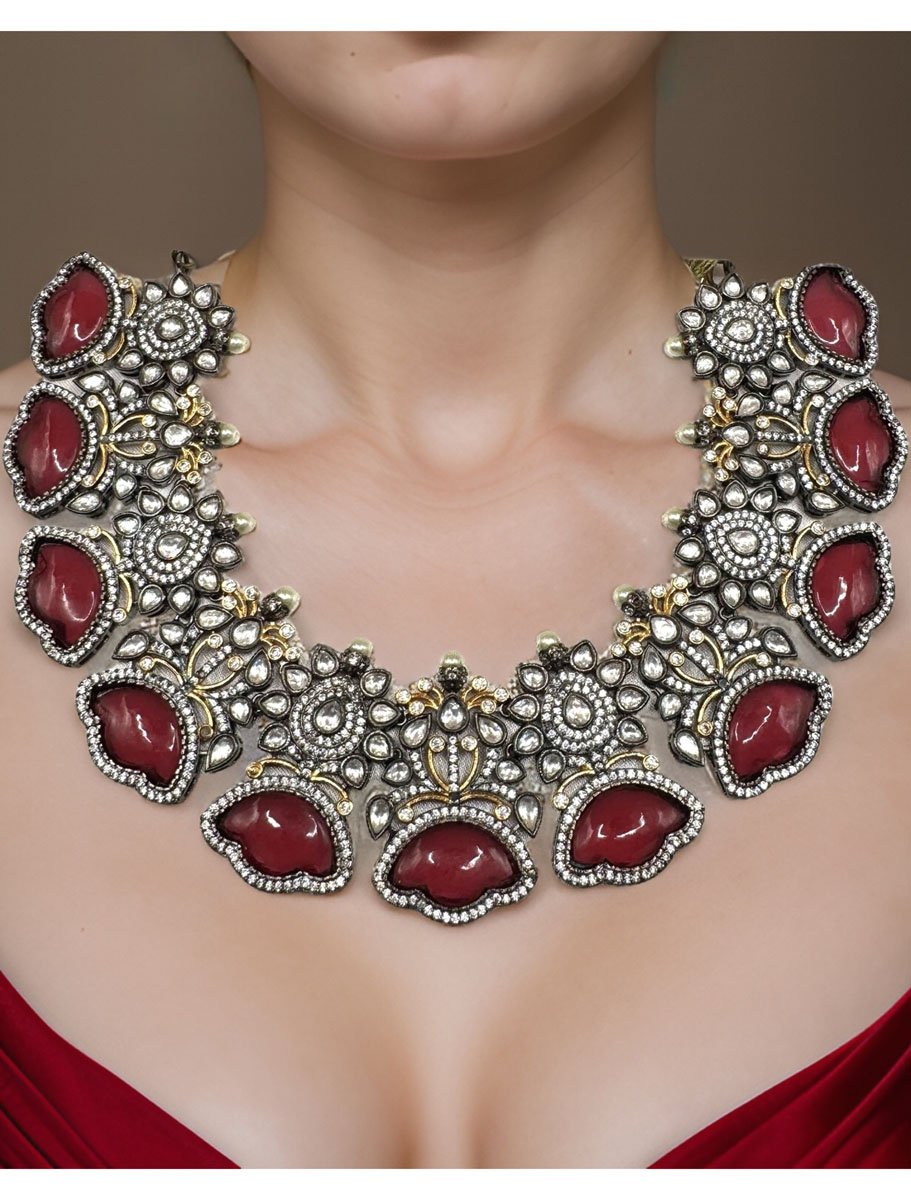 The Sabyasachi-inspired Handmade Jadau Kundan Necklace features a captivating Ruby Doublet Stone and intricate craftsmanship. This necklace is designed to grace the neckline perfectly, making it an ideal choice for parties and special occasions.