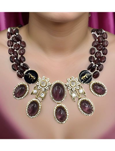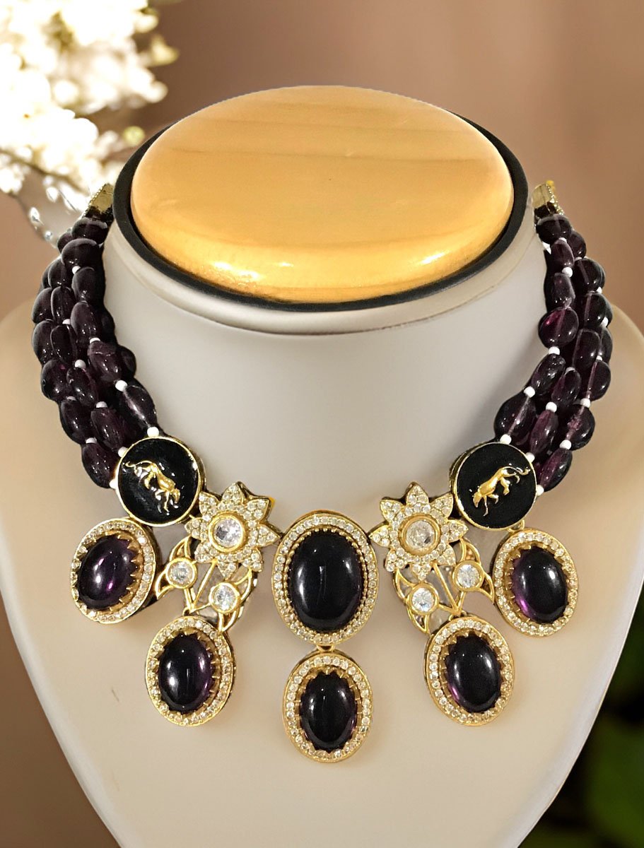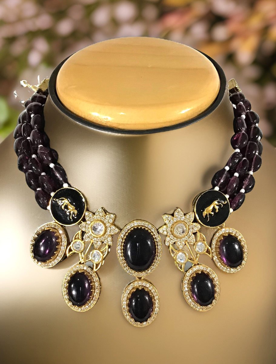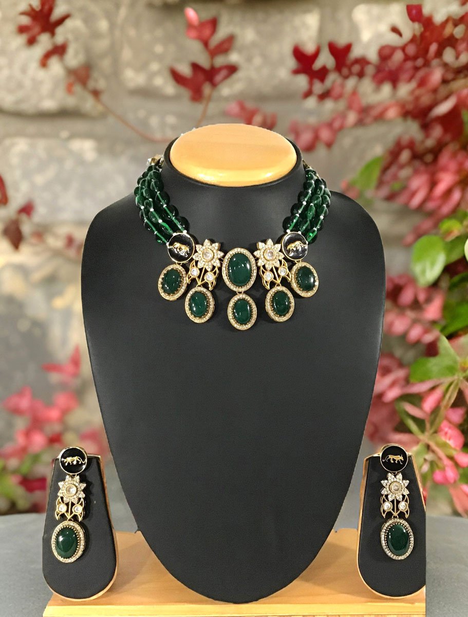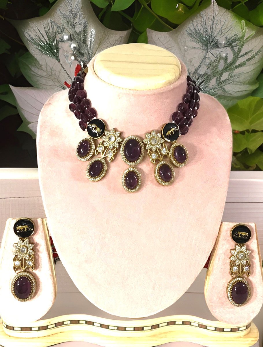 Beautiful high end choker can be paired with your favorite outfit. This necklace set is made with premium quality Kundan Doublet Stones, Emerald Green (or Dark Purple/Maroon) onyx semiprecious beads. Premium Panther Lion Finish in the pendant gives it a statement look. This is the perfect piece for the perfect occasion.The intricate and elegant designs will surely get you tonnes of compliments.