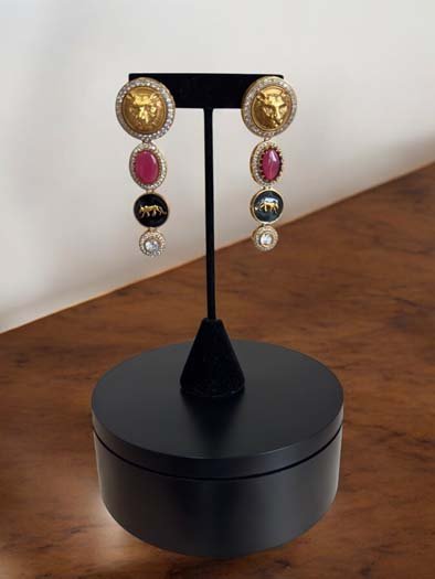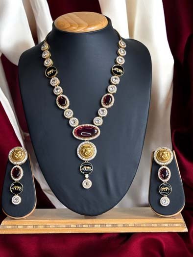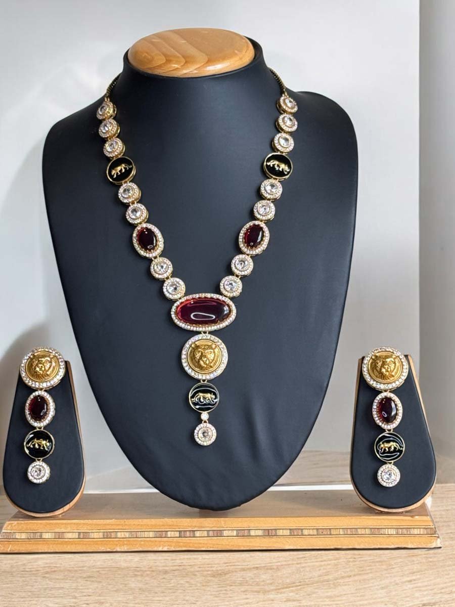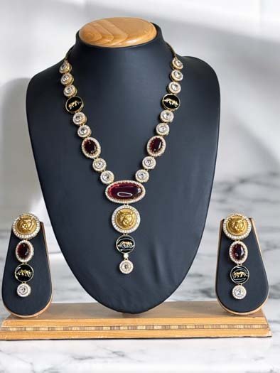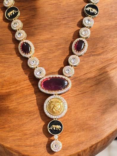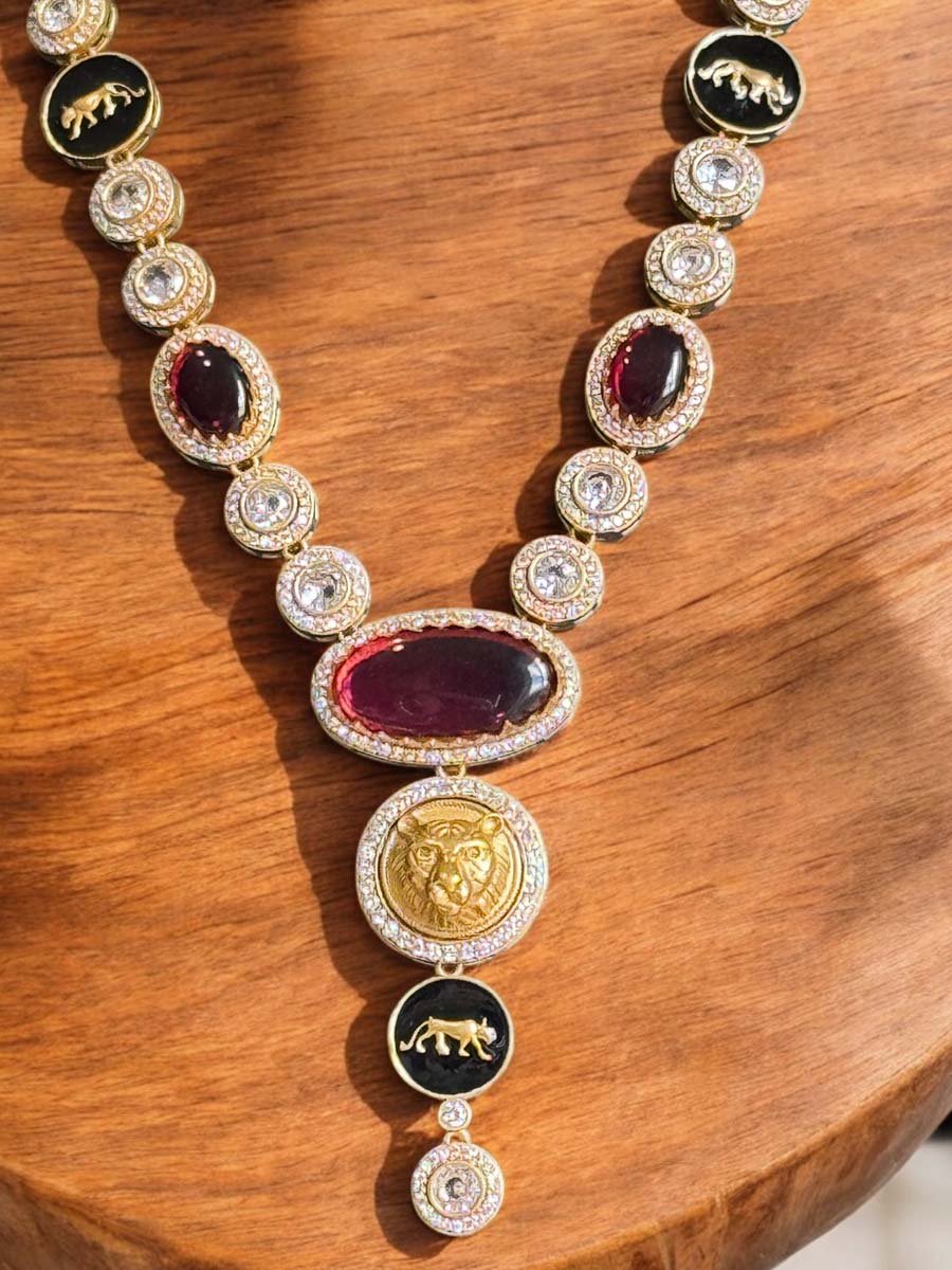 Sabyasachi inspires jewelry designs that reflect the sense of luxury, tradition, and attention to detail. Must wear for any occasion. Overall, Sabyasachi-inspired jewelry would likely be characterized by its ornate designs, rich colors, and meticulous craftsmanship, echoing the essence of his celebrated fashion creations.Designer necklace set, made in brass with golden polish, studded with Mossanite, Ruby Red Monalisa stones and AAA quality CZ stones. Very smooth finishing, looks stylish upon wearing. Perfect for party wear. The graceful presence of Bengal tiger in the necklace set adds a captivating allure to the ensemble, making it a true statement piece for any occasion!!