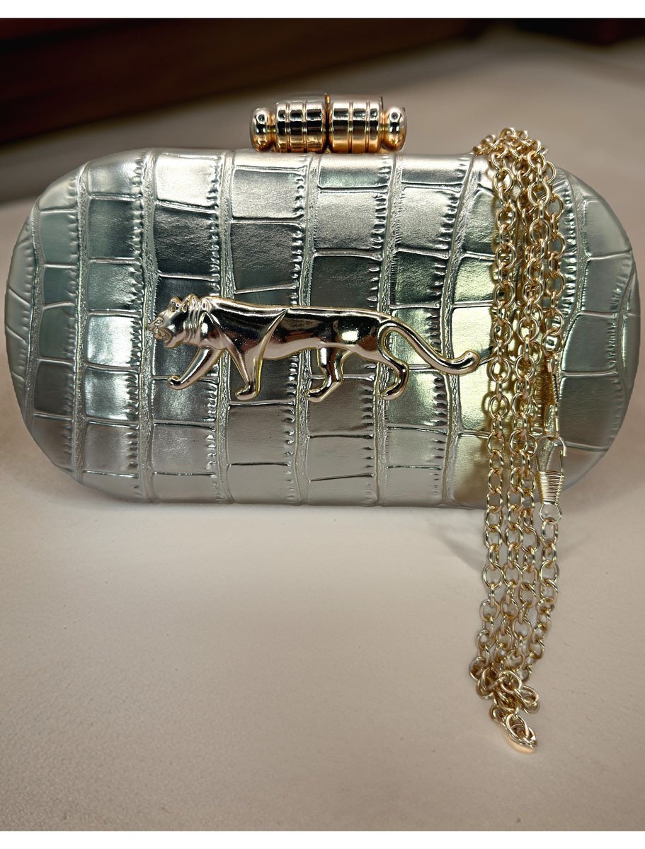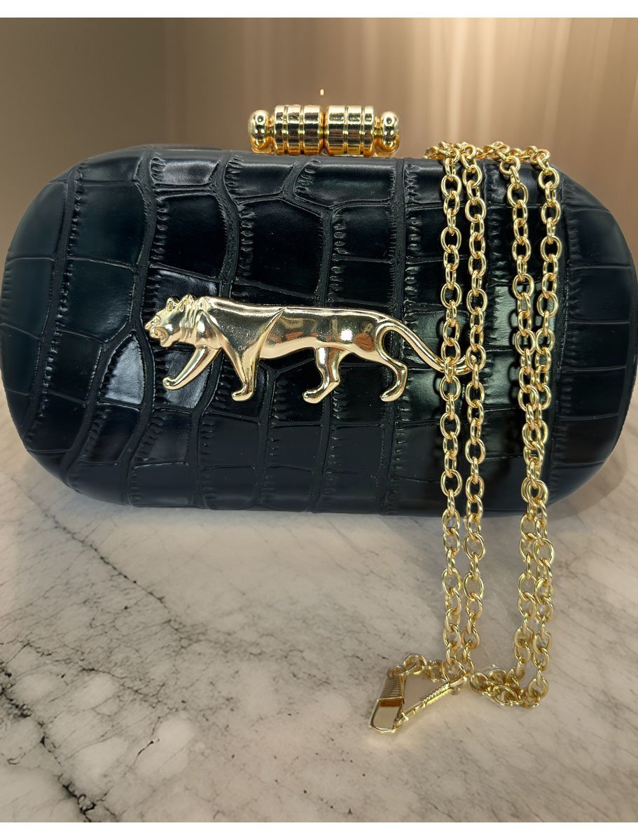Introducing Sabyasachi Inspired "THE ROYAL BENGAL MINAUDIÈRE Croco Leather clutch bag - Replica same as the showroom model). Oval shaped, Brass metal frame, Fully convered with Croco leather (front and back). The clutch is embellished with the Royal Bengal tiger motif crafted in 24k gold-plated metal hardware and it comes with a detachable chain. Elevate your style with this top quality, branded clutch bag. This clutch bag is an ideal choice for fashion-forward women looking forward to create a style statement. This clutch bag comes with a Sabyasachi logo printed dust bag and the branded box.