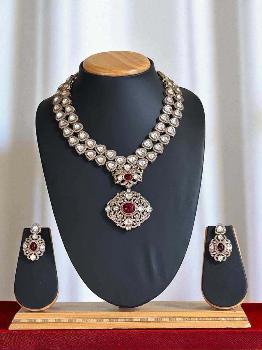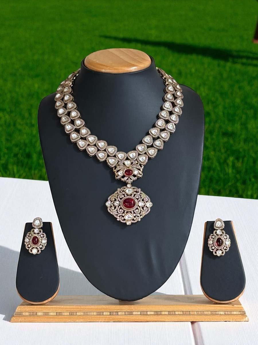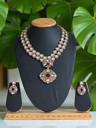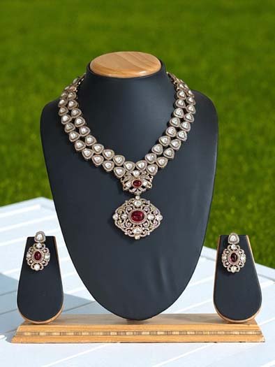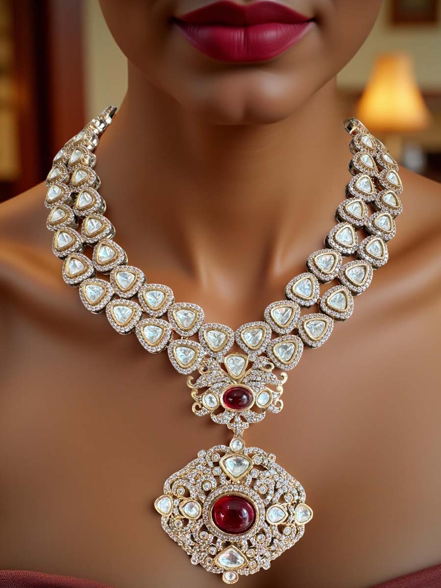 The handcrafted jewelry with the Sabyasachi-inspired Jadau Kundan Necklace, adorned with doublet stones. This piece showcases an elegant and intricate craftsmanship, making it a true work of art.