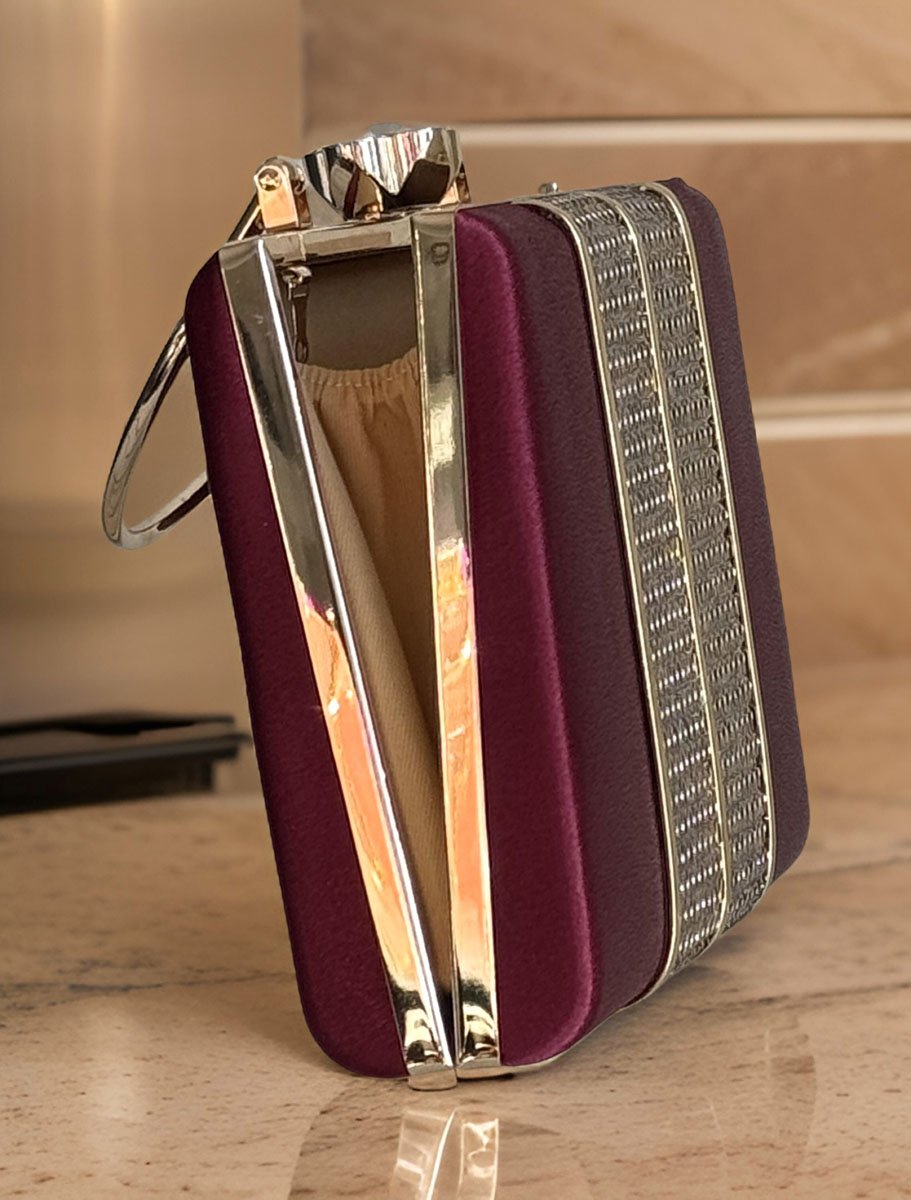 Elevate your evening look with this captivating clutch. The shimmering exterior features a golden patch design detail, adding a touch of texture and elegance. It is compact and versatile, this clutch is perfect for evenings, cocktails, or special occasions like weddings. A beautiful complement to your evening dress, casual dresses! This bag is fully covered with a plain colorful satin fabric (front sidess and back) and comes with golden accessories (handle, 18" long chain). This bag has a tight snap Glass Flower closure at the top to protect your belongings. An interior has velvet lining. Elegant yet stylish!! It is big enough to hold you things ( phone, money, keys, cards, mini mirror, lipstick etc ).