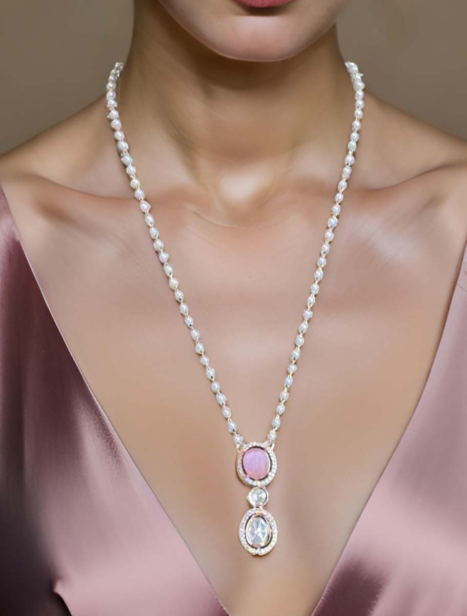 Beautiful pearl necklace featuring natural freshwater pearls and a stunning Kundan pendant. This Pendant set is charming 14k gold-plated jewelry with premium Kundan pendant and the delicate elegance of hand-woven freshwater pearl chains. This super light weight necklace is effortlessly chic. It makes a perfect addition to your look for day events, festivals, and weddings. Its contemporary look goes well with Indo-Western outfits. Elevate your look with this timeless and elegant pearl necklace. This pendant set is available in multiple colors!!