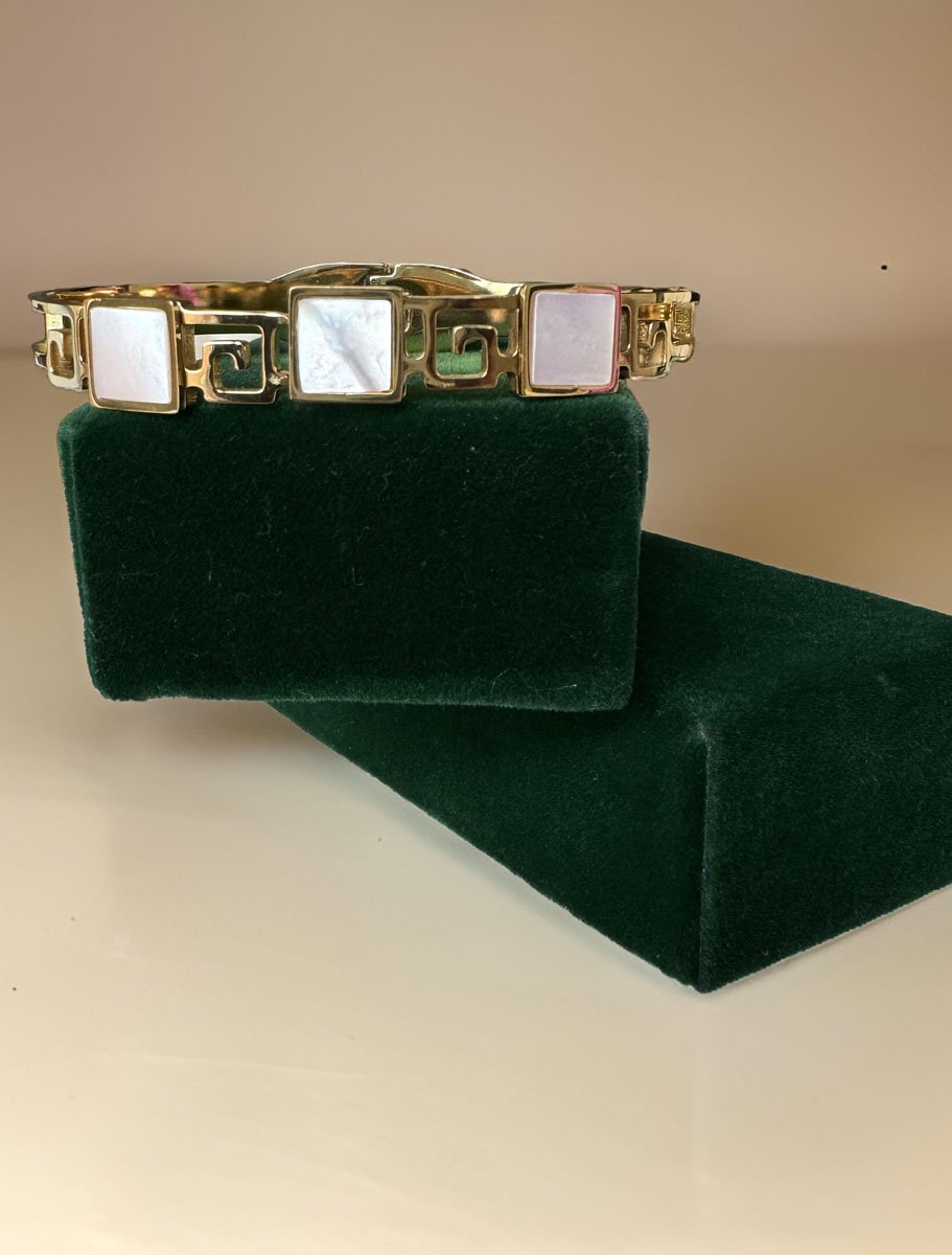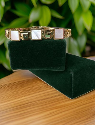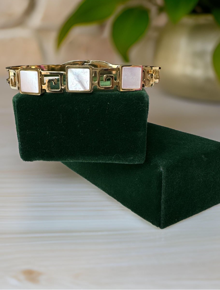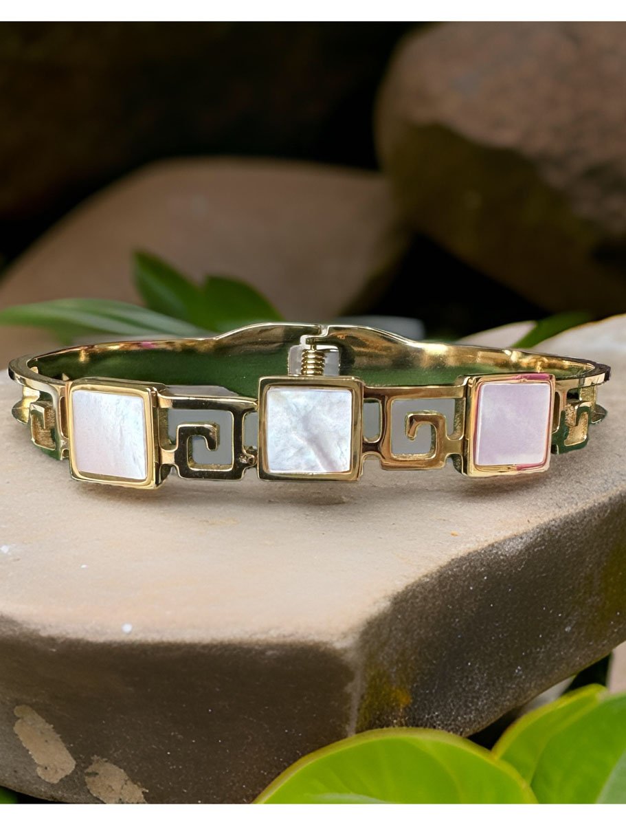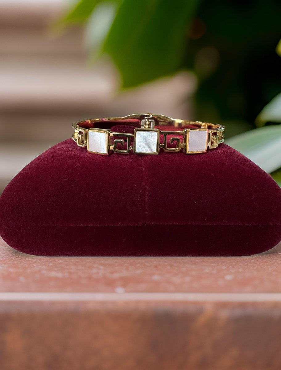 This stunning Triple Square shaped MOP cuff bracelet will elevate your style. Made of brass and plated in 18K gold, this bracelet is adorned with natural mother of pearls that are delicately framed in gold. The result is a dainty yet statement-making bracelet that will add a touch of elegance to any outfit.The adjustable cuff design makes this bracelet easy to wear and will fit most wrist sizes. Whether you're dressing up for a special occasion or adding a touch of sophistication to your everyday look, this bracelet is the perfect accessory. It also makes for a thoughtful gift for someone special. Mother of Pearls have long been loved. Openable Kada, fits well on 2x4 wrist.