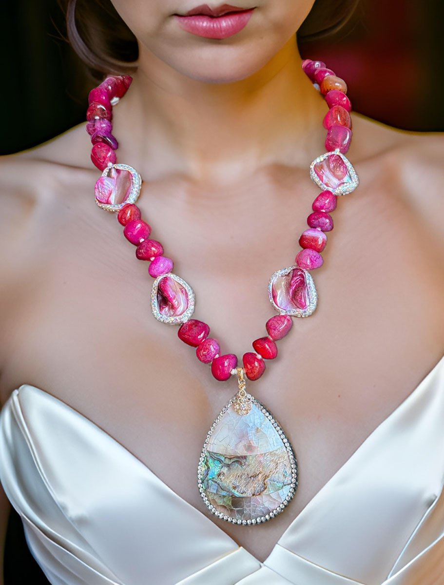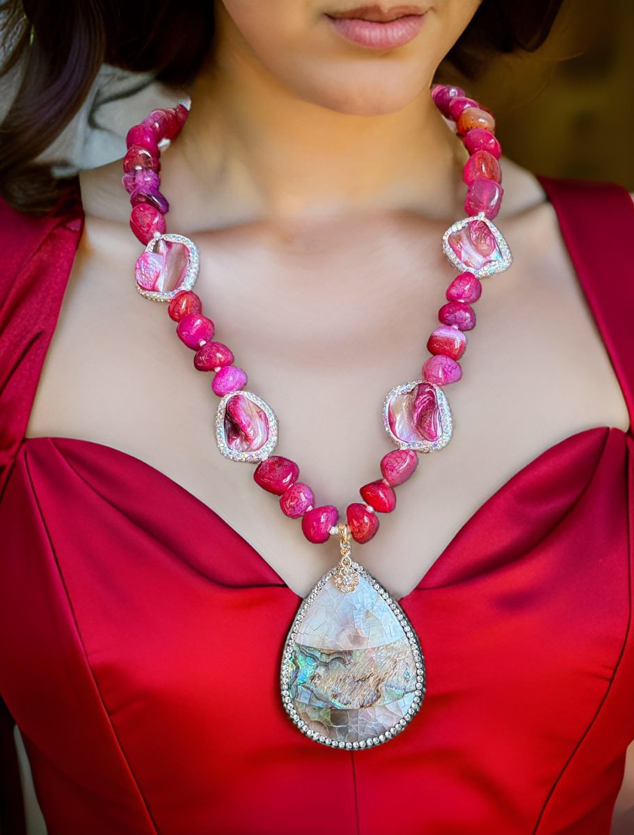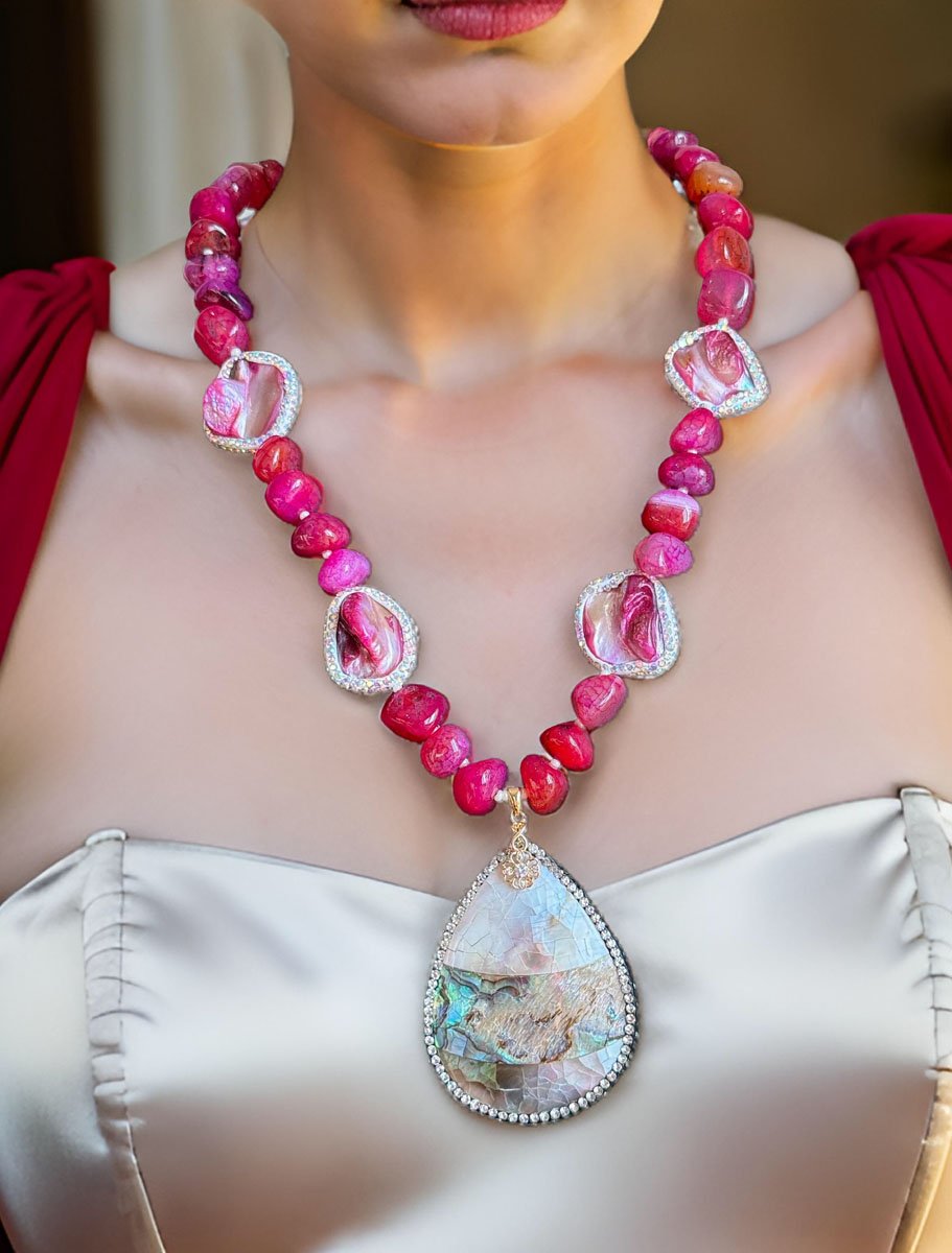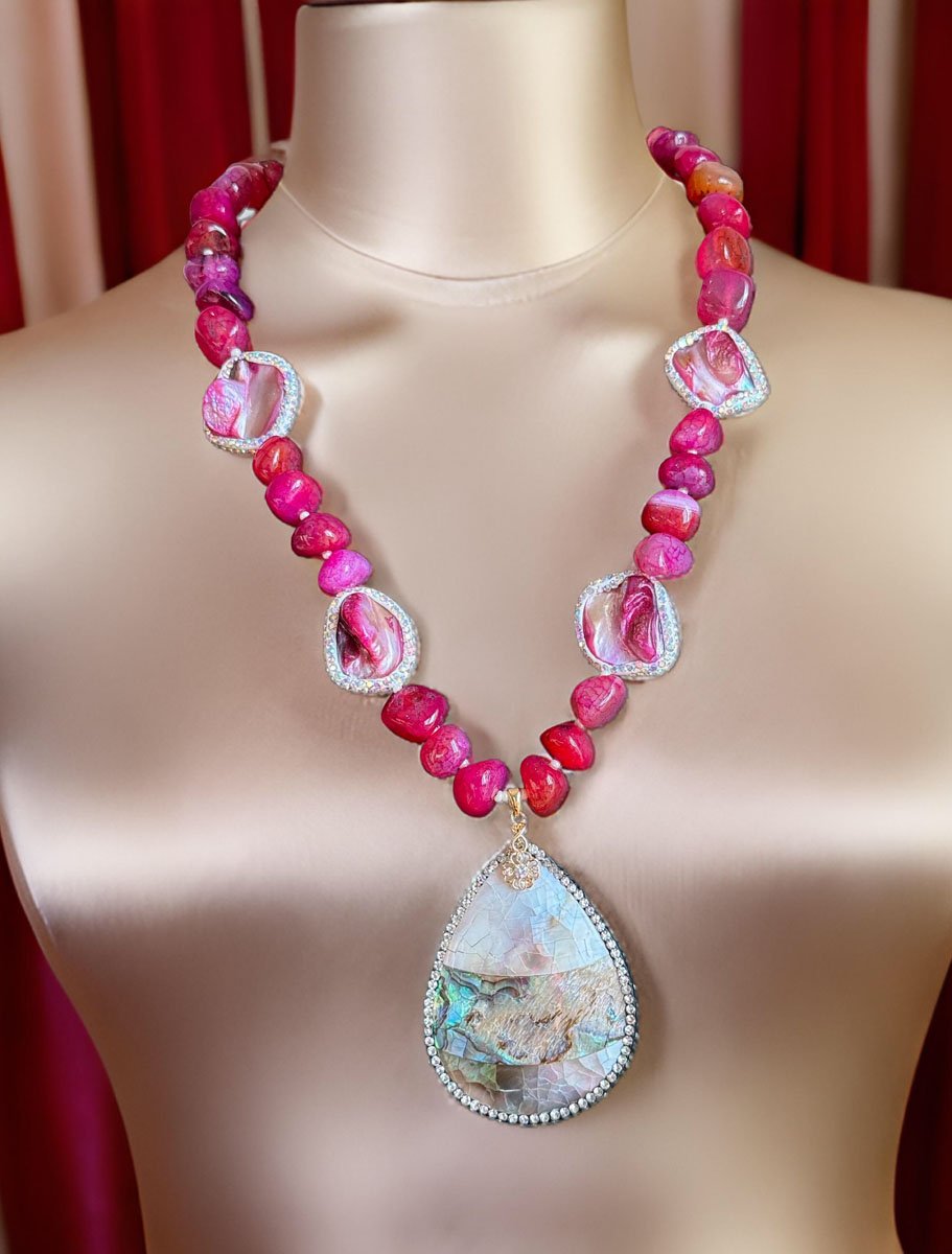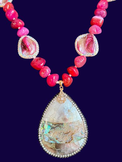Elevate your fashion style with Beautiful Turkish Beads Long Mala with handmade Large MOP Abalone teardrop pendant. Absolutely gorgeous, feminine & romantic, tasteful but eye-catching! Bright color, finest quality shiny pearls gives it a stunning look! MOP pendant and Natural stone's border are embellished with micro CZ stones. Mother of Pearl brings the gentle healing power of soothing and calming to the emotions. Pearls are historically symbolic of purity, and innocence, and are known as a "stone of Health". It enhances personal integrity. Versatile Statement: Whether it's a festive occasion, a party or a cultural event, this mala effortlessly becomes the focal point of your ensemble.