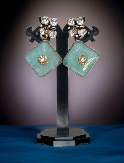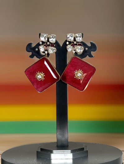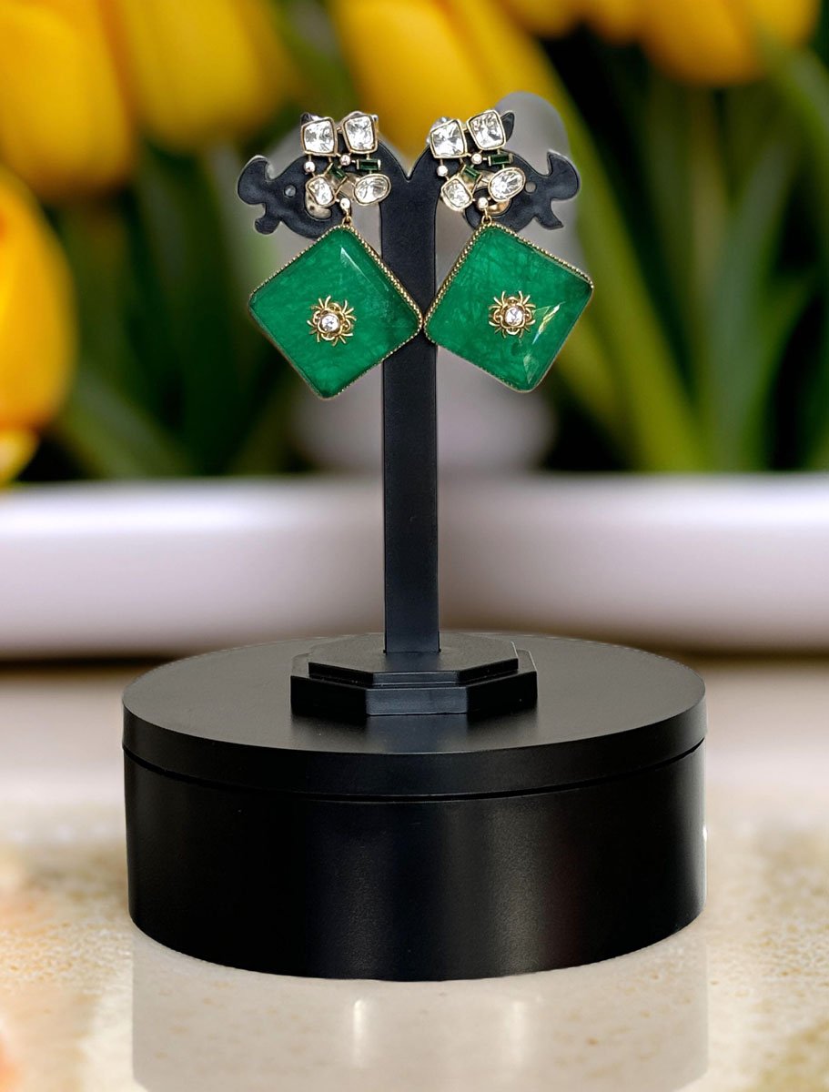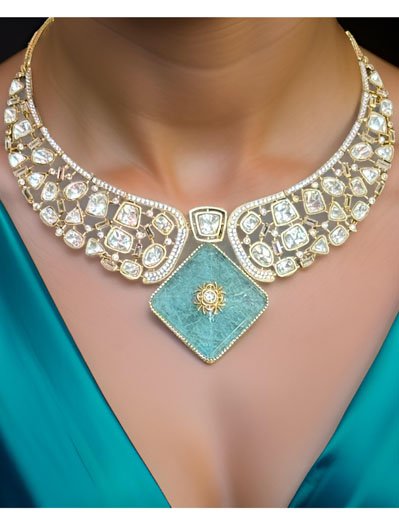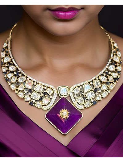 Tyaani Inspired statement necklace is a stunning piece of beauty that will enhance your look instantly. This necklace features Superior Quality of Kundan, Natural stones (for pendant) and AAA quality CZ stones, creating a timeless and sophisticated look perfect for weddings or special occasions. It has an adjustable gold chain. The gold finish and shiny CZ stones borders add an extra touch of elegance to the piece. Perfect for any occasion, this luxurious set is sure to leave a lasting impression on all who behold it. The necklace is light weight with super smooth finishing, sits comfortably on the neckline, enhancing your natural beauty and adding a glamorous touch and elegance to your ensemble!! This necklace set is available in Ruby, Emerald, Mint Green and Sapphire (Purple) Stone pendant.
