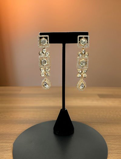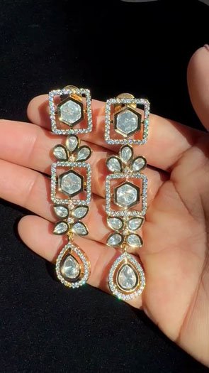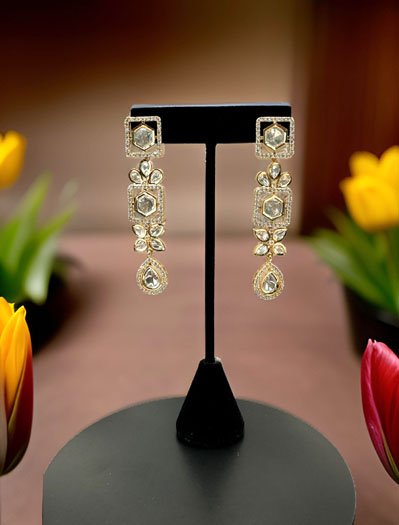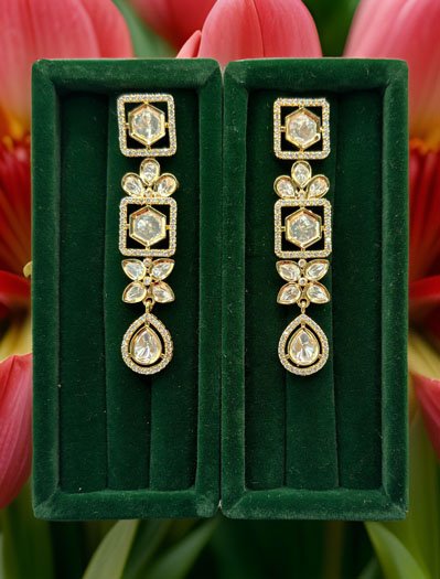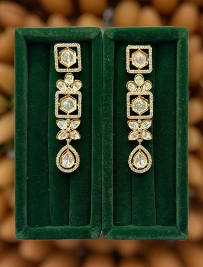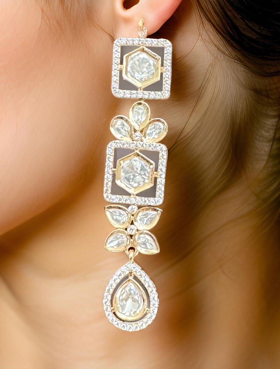 Exquisite Tyaani inspired uncut polki light weight kundan earring set with carved stones. The earrings are beautifully designed to complement any outfit, adding a touch of elegance and sophistication to your look. These earrings are 18 carat gold plated and crafted with love using premium quality white uncut polki kundan and AAA quality CZ stones, just for you!! A Perfect party earrings and can be styled with Western Outfits, Sarees, Lehengas.