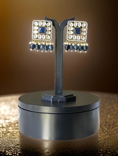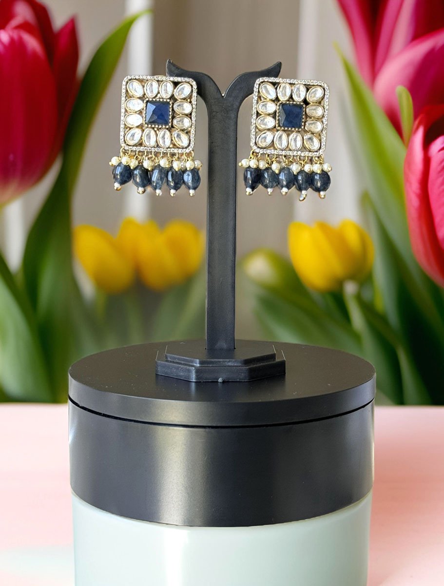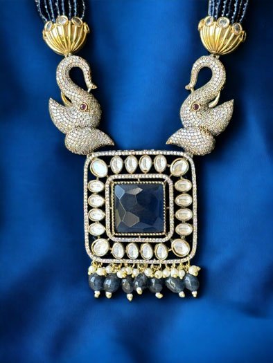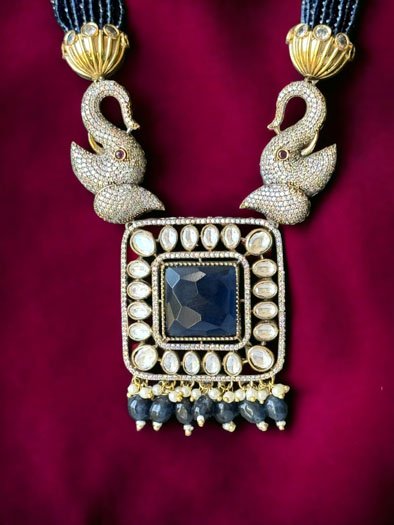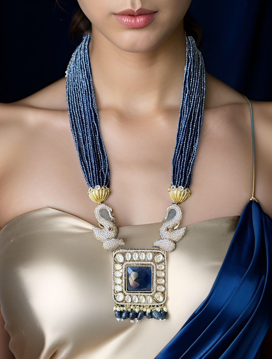 Navy Blue Uncut Polki CZ Long Victorian Necklace Set