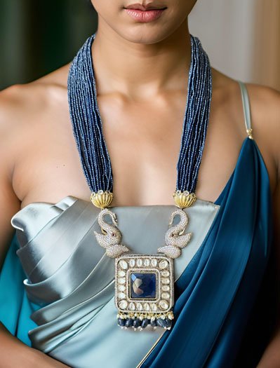 Make a statement with this Celebrity Inspired Designer Necklace Set. This beautiful necklace features Superior Quality Navy Blue Doublet Stone, Premium Quality Radiant Moissanite Polkis and intricate detailing of CZ elephant's face, exuding timeless elegance. Elevate your look with this stunning piece that blends traditional charm with contemporary flair. Its timeless design and superior quality make it an essential addition to your jewelry collection. Be the epitome of grace and charm; shop our collection today. Beautifully Crafted CZ elephant faces and shiny hydrobeads mala adds an elegant touch and radiant finish to this necklace. This designer necklace is sure to impress with its elegant craftsmanship and impeccable quality!!