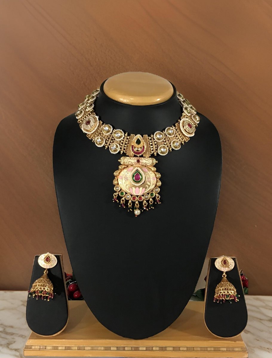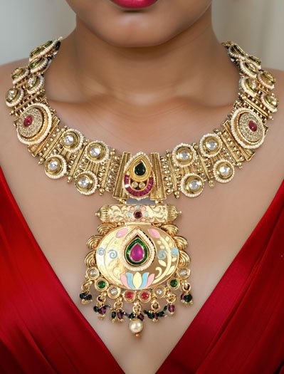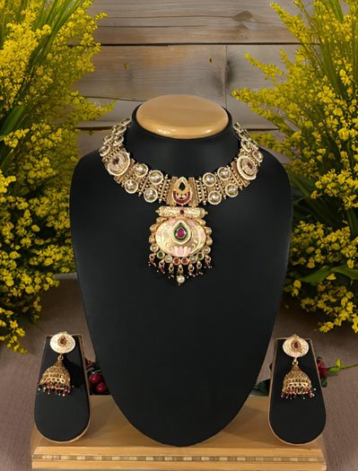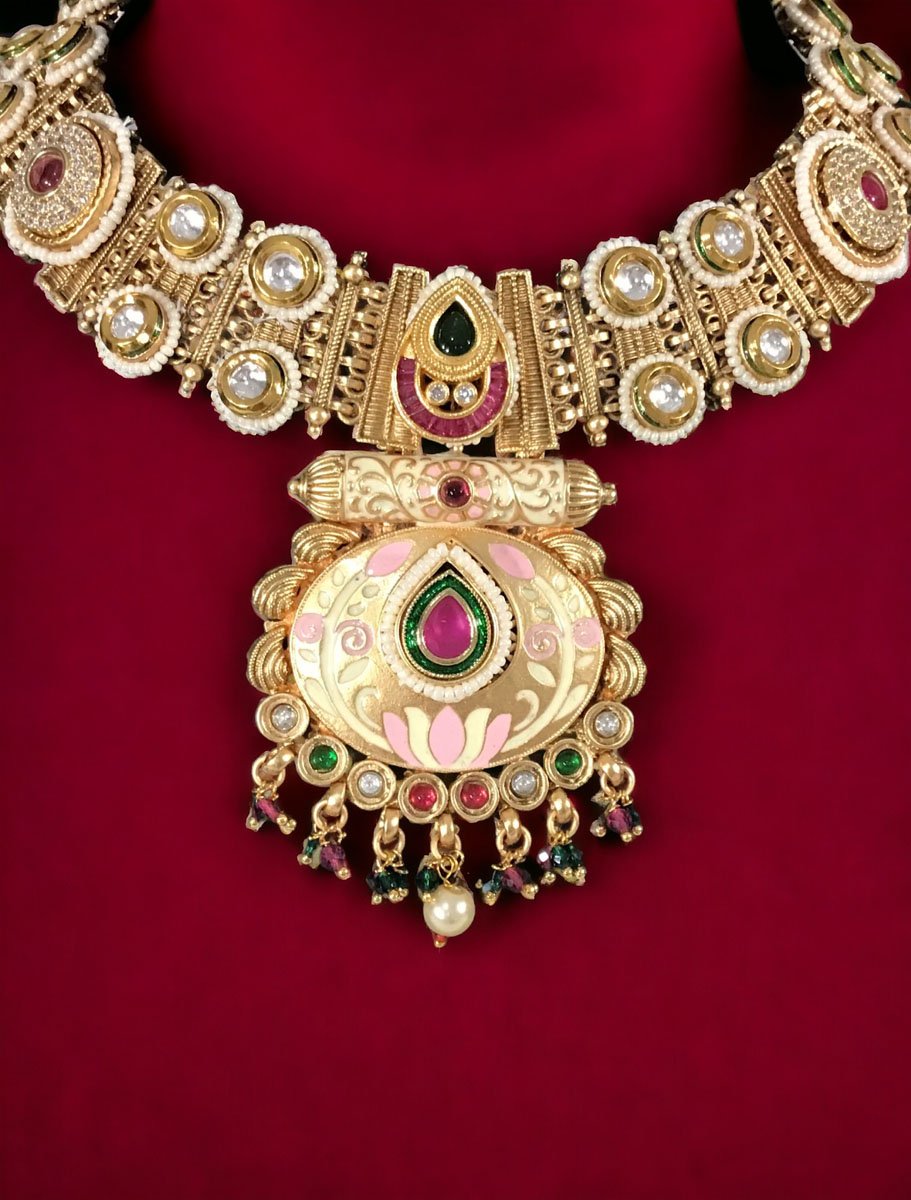 VeroniQ Trends-Elegant Gold Plated Kundan Rajwadi Necklace set is made in copper, beautfully crafted and studded with premium quality Kundan. Kundan is a traditional form of Indian Gemstone jewellery involving a gem set with a gold foil between the stones and its mount, usually for elaborate necklaces. The method is believed to have originated in the royal courts of Rajasthan and Gujarat. It is one of the older forms of jewellery made and worn in India. The word kundan means highly refined gold, and a highly refined and pure form of molten gold is used.
