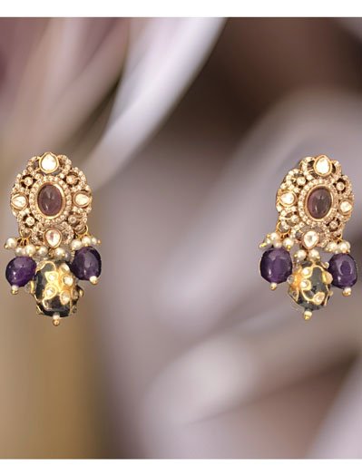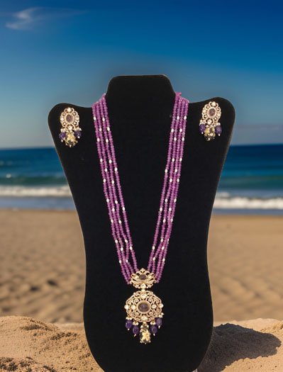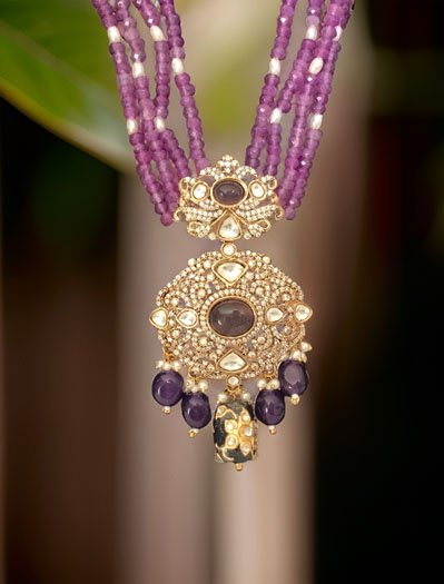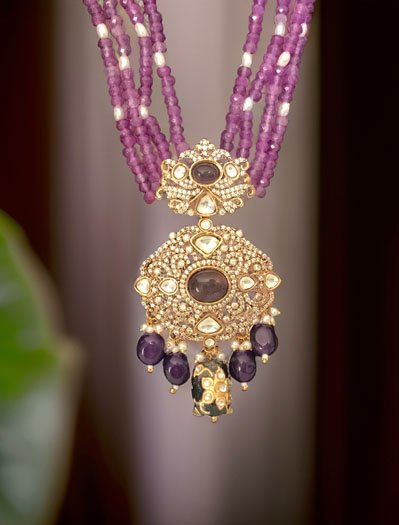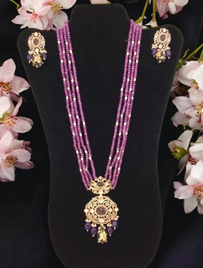 Nicely crafted Victorian style Kundan Pendant Long set made with copper, High quality Kundan, doublet stones and purple pearls, decorated with purple floating onyx beads. It comes with matching earrings. Perfect for party wear.