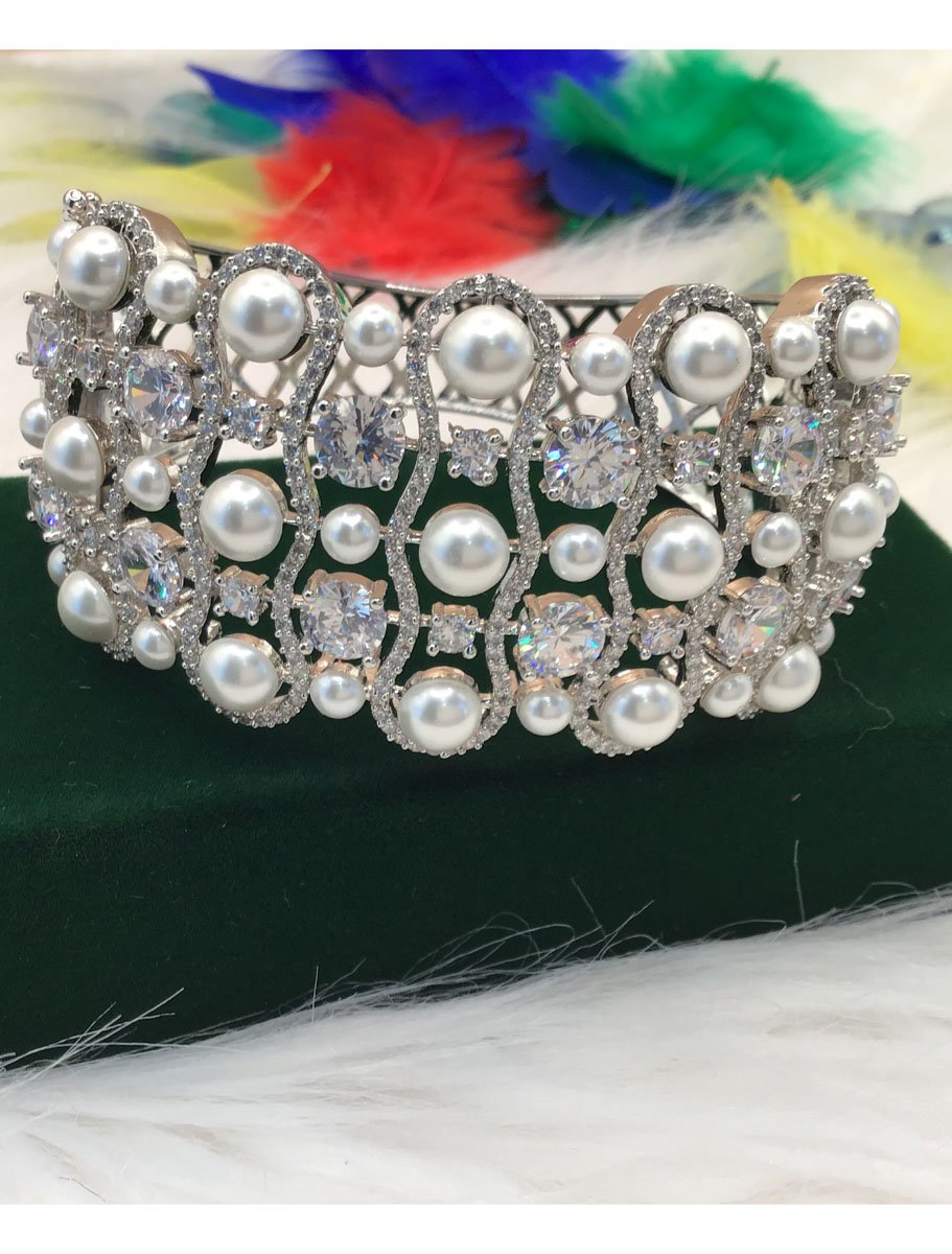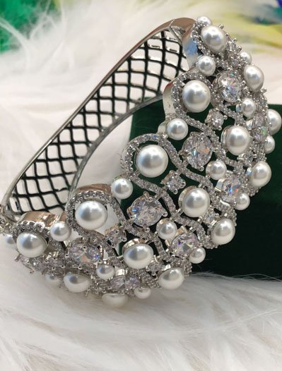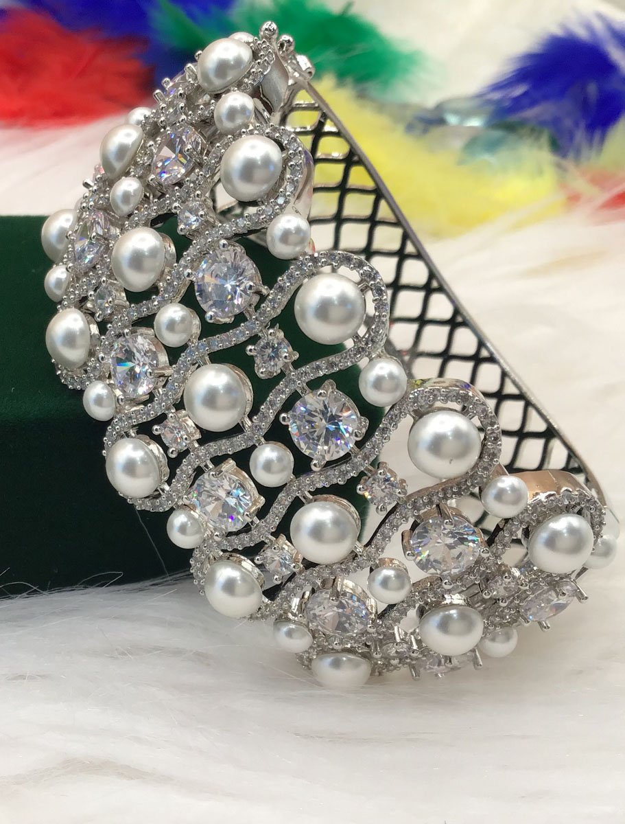 The Premium Quality White Pearl/CZ Rhodium Kada, crafted in silver, is adorned with lustrous pearls and sparkling CZ stones. It features an adjustable openable design and boasts exquisite craftsmanship, exuding elegance. Ideal for adding a touch of sophistication to your party attire.