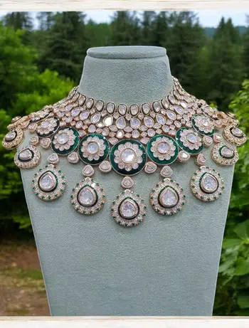 The premium bridal set features an impressive array of high-quality uncut kundan and moissanite carefully selected to create a gorgeous visual effect. From the majestic necklace to the delicate earrings, every piece is a testament to Yashti Jewelers' dedication to provide best quality handcrafted jewelry. Whether you're looking for a classic and ethnic design or a modern and contemporary twist, this range of sets is sure to exceed your expectations, providing a truly unforgettable and luxurious bridal experience.
