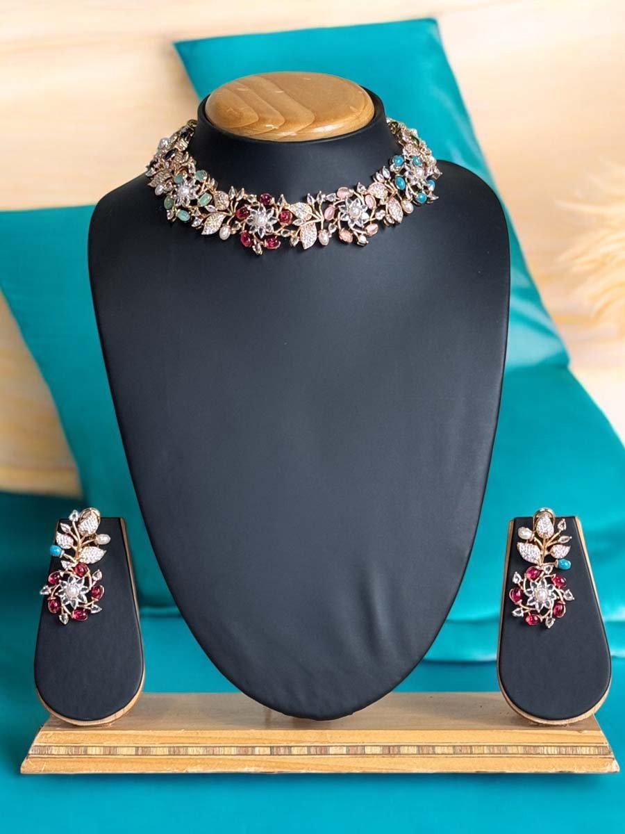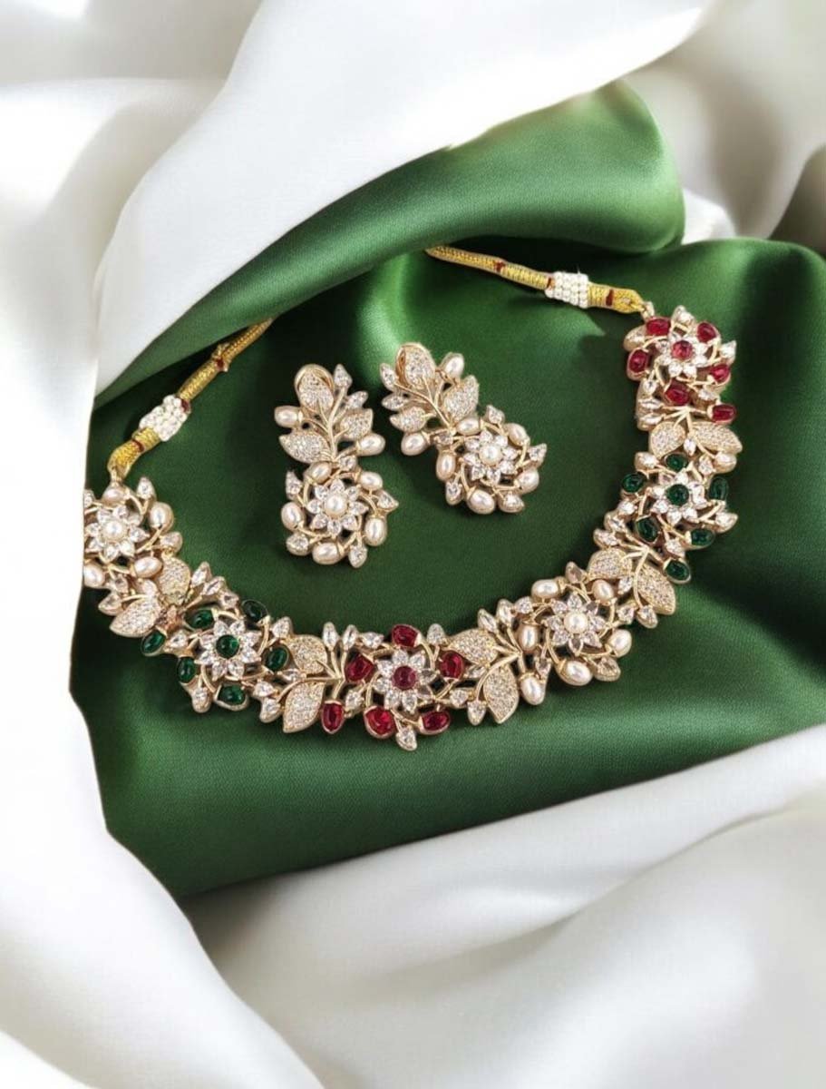Indulge in the opulence of this beautiful AD CZ Necklace with Earrings, a true masterpiece of exquisite craftsmanship. This stunning necklace creates a mesmerizing display of elegance and sophistication. The intricate design and flawless finish of this AD Jewellery is a testament to the unparalleled skill of our artisans. The Multicolor Gemstones decorated with thin CZ stone and pearls carving adds a touch of elegance and sophistication to the overall look. Crafted with meticulous attention to detail, this necklace set is made to impress. Perfect for any occasion, this luxurious set is sure to leave a lasting impression on all who behold it. The necklace is light weight with super smooth finishing, sits comfortably on the neckline, enhancing your natural beauty and adding a glamorous touch to your ensemble.